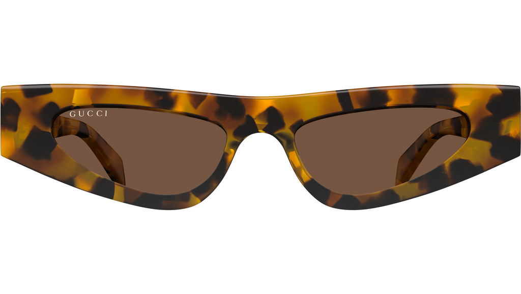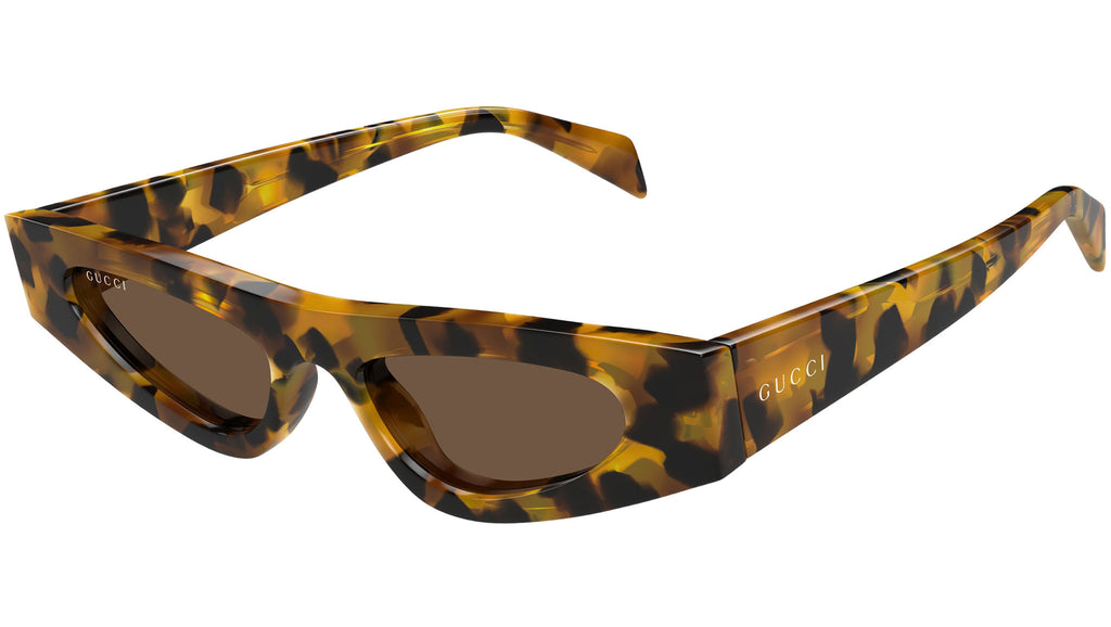 Occhiali da sole Gucci modello GG1779S linea Fashion in acetato riciclato forma a gatto codice colore 004 avana maculato lucido con aste tartaruga e lenti marrone tinta unita. Rivenditore autorizzato Gucci online. Gli occhiali vengono consegnati con custodia e accessori originali e sono coperti dalla garanzia ufficiale di 12 mesi del produttore.