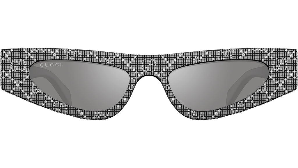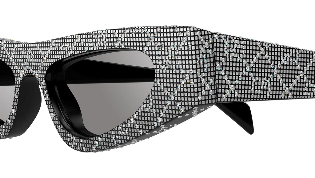 Occhiali da sole Gucci modello GG1779S linea Fashion in acetato riciclato forma a gatto codice colore 009 nero lucido con strass di cristallo all over e argento lucido con aste nero e lenti grigio pieno + argento super forte. Rivenditore autorizzato Gucci online. Gli occhiali vengono consegnati con custodia e accessori originali e sono coperti dalla garanzia ufficiale di 12 mesi del produttore.