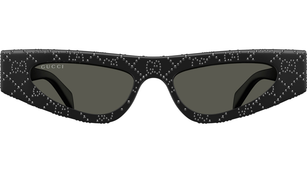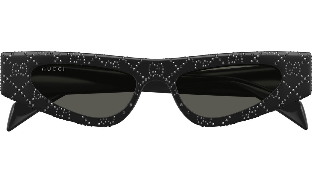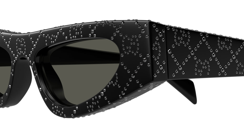 Occhiali da sole Gucci modello GG1779S linea Fashion in acetato riciclato forma a gatto codice colore 010 nero lucido con strass ematite jet all over e nero lucido con aste nero e lenti grigio tinta unita. Rivenditore autorizzato Gucci online. Gli occhiali vengono consegnati con custodia e accessori originali e sono coperti dalla garanzia ufficiale di 12 mesi del produttore.