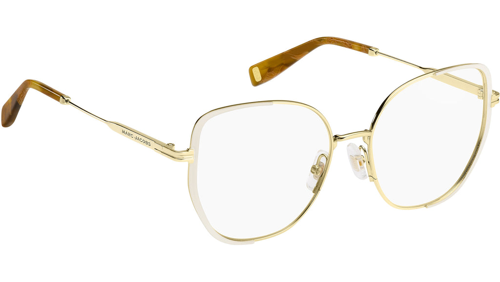 Occhiali da vista Marc Jacobs modello MJ 1103 codice colore VVP in metallo oro avorio con lenti demo. La collezione di occhiali da donna Light/Merge di Marc Jacobs, dalle forme semplici e raffinate, si trova in perfetto accordo con l'estetica del quiet luxury. La selezione include una montatura da vista interamente in metallo, con piccoli tocchi di colore sul frontale, e due occhiali da sole realizzati in un mix di acetato e metallo. Le silhouette moderne sono abbinate ad aste metalliche dalla forma distintiva, rifinite con i dettagli iconici del brand: la doppia JJ in metallo e il logo inciso al laser, oltre al monogramma MJ sui terminali e sui naselli regolabili. Rivenditore autorizzato online Marc Jacobs.