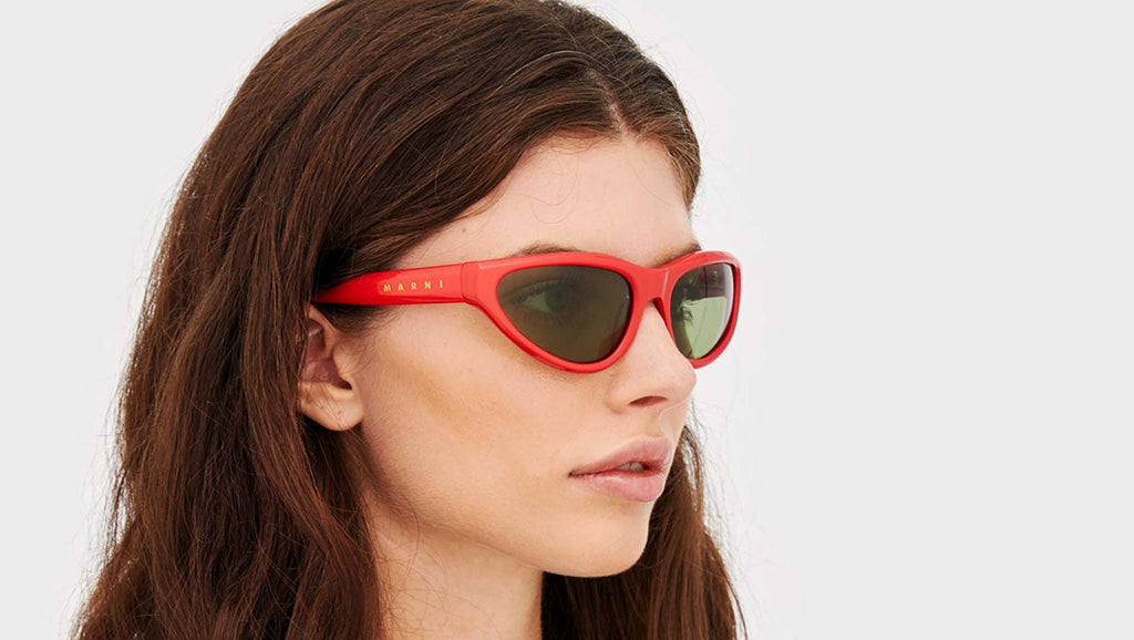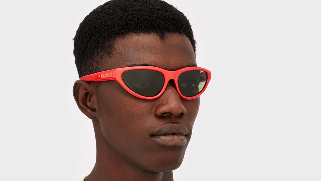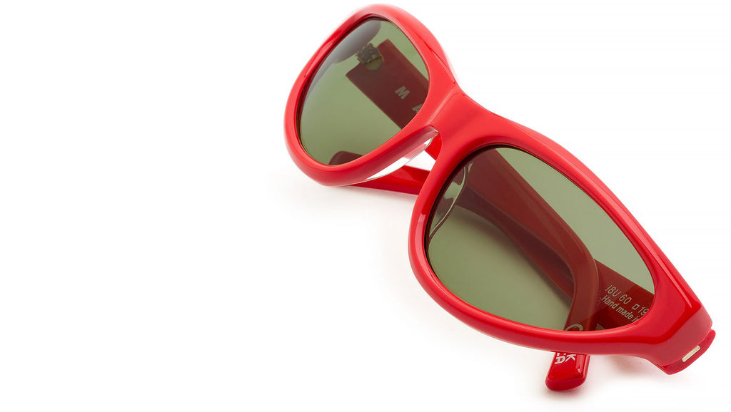 Designed exclusively for Marni, Mavericks reinterprets 1990s aesthetics with a fresh, forward-looking approach to style. A low-riding, horizontal frame, Mavericks features curved acetate construction for a wrap-around design. Carved rims elevate the model’s high-tech aesthetics, for an authentic futuristic piece of eyewear. This model comes in a solid red acetate with green tinted lenses. Sizes: R Lens Width: 60 mm. Frame Front: Frame Side: 135 mm. Product Code Size R: I8U