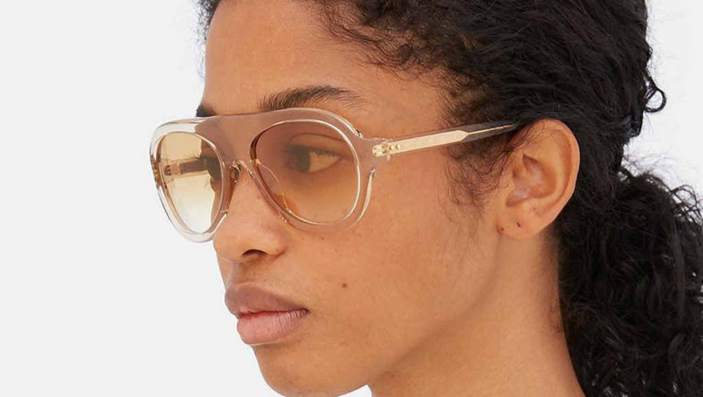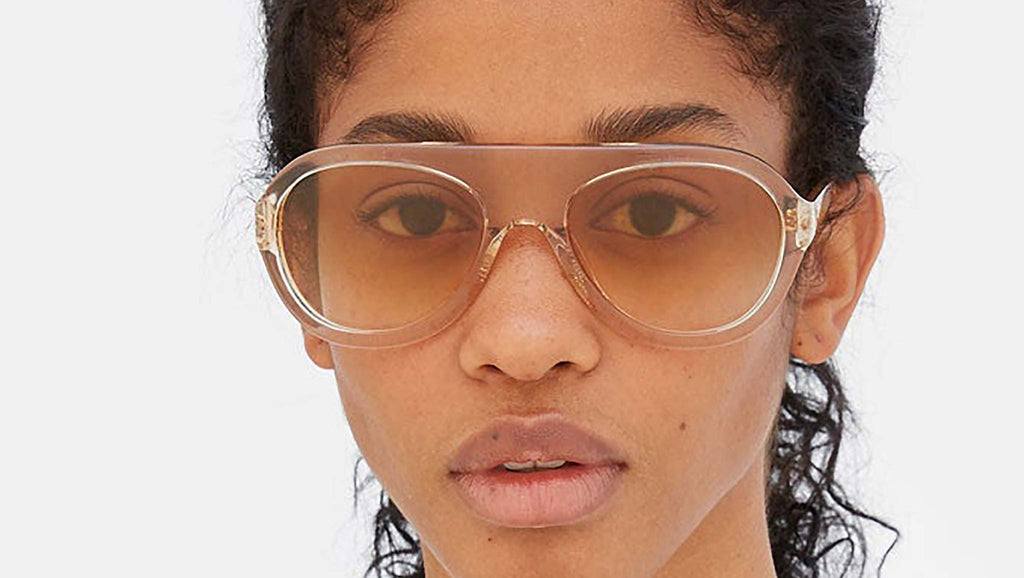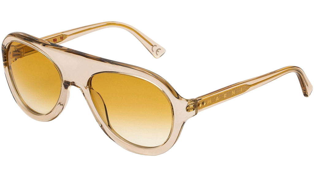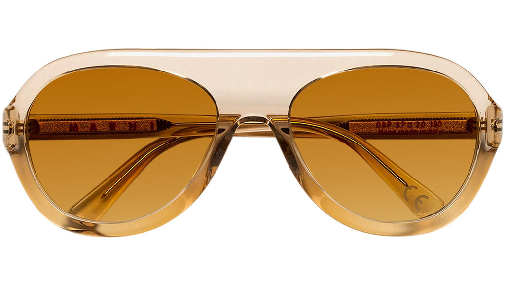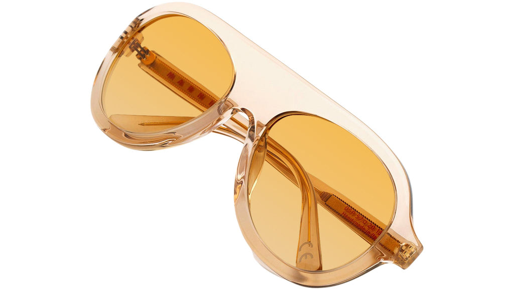 Mount Toc is a bold interpretation of classic aviator-style designs. In true Marni fashion, this timeless design was updated with bold geometries and quirky detailing, for an aesthetics that references 1970s sportswear glamour. Its broad structure features a sturdy nose-bridge and pear-shape lenses encased within chunky acetate rims. A unique detail: wrap-around temple design. This model comes in a crystal resin acetate with light tinted lenses. Sizes: R / R Lens Width: Frame Front: Frame Side: Product Code Size R: 05P Product Code Size R: TR9