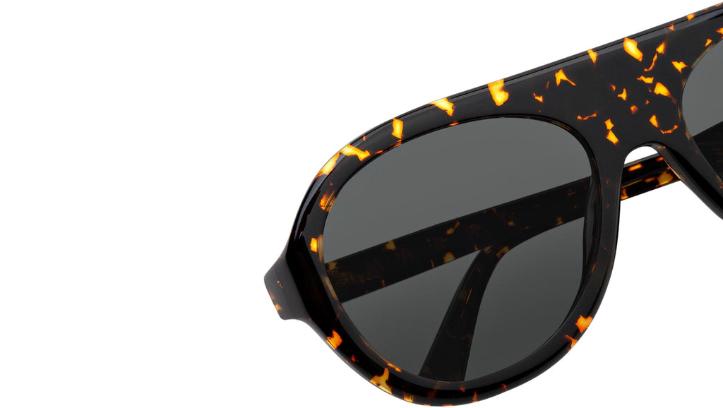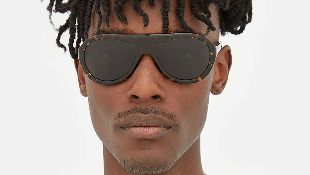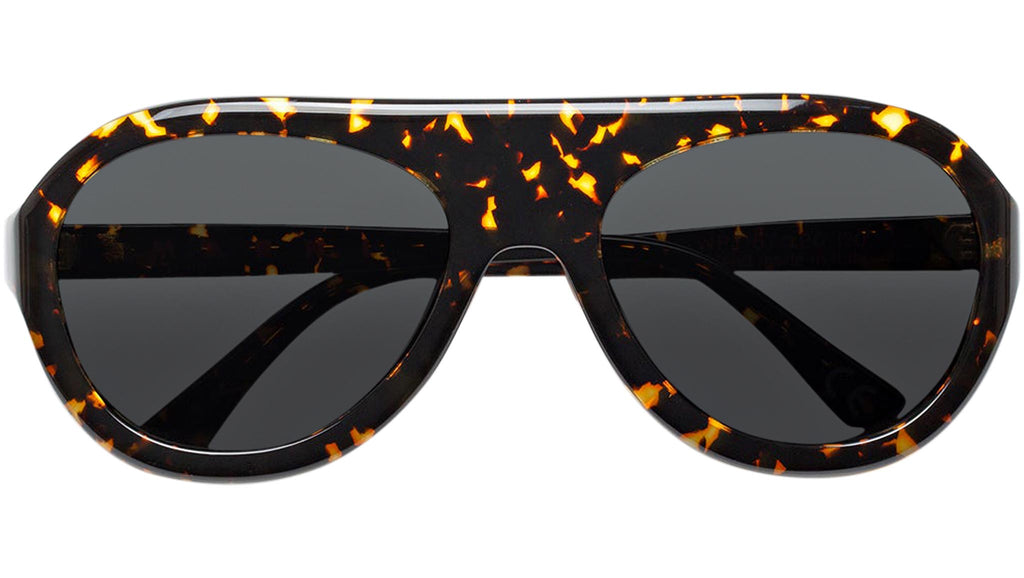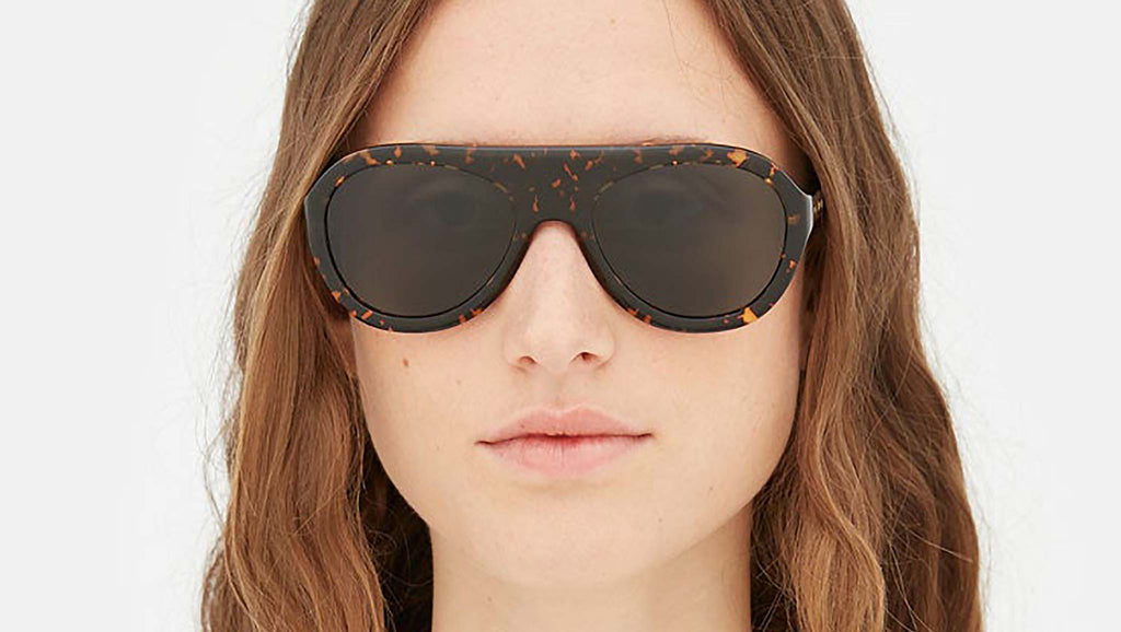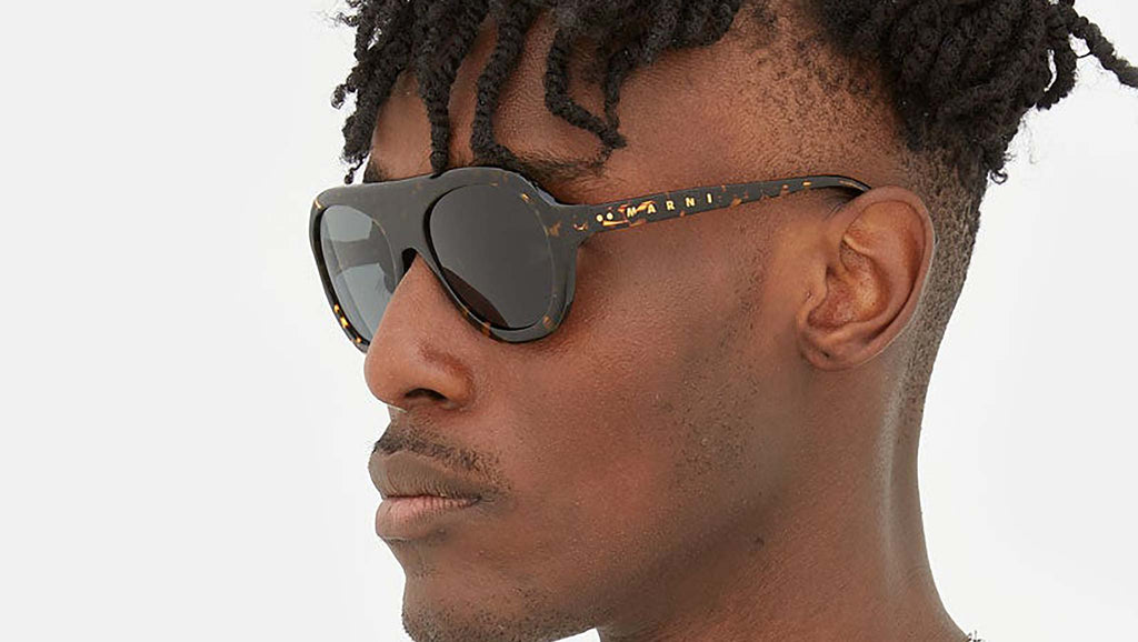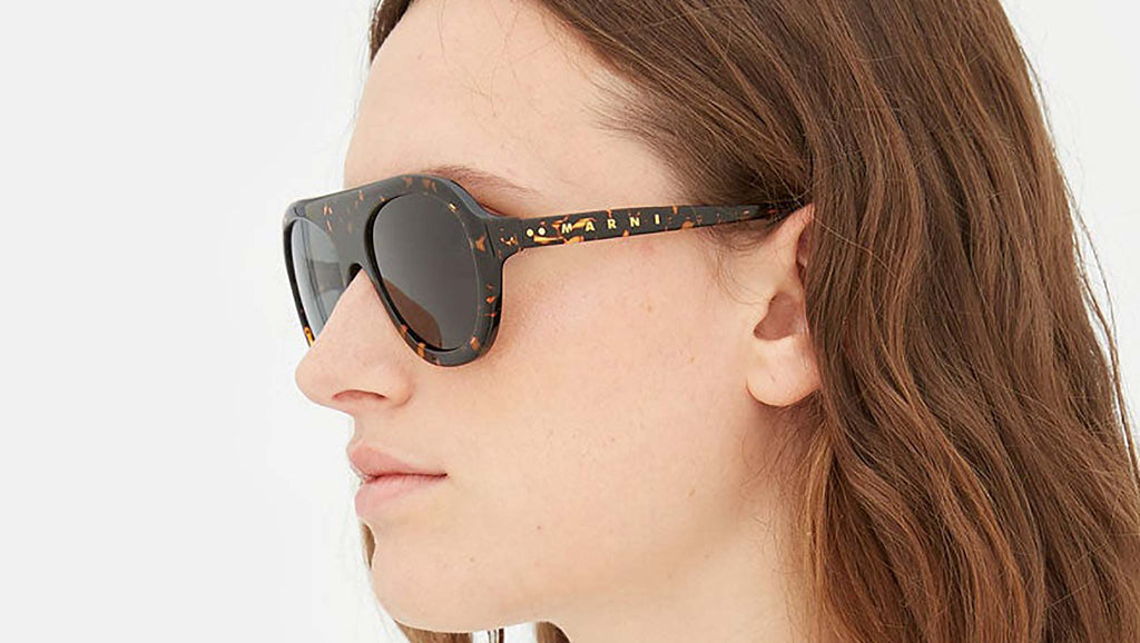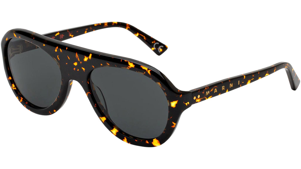 Mount Toc is a bold interpretation of classic aviator-style designs. In true Marni fashion, this timeless design was updated with bold geometries and quirky detailing, for an aesthetics that references 1970s sportswear glamour. Its broad structure features a sturdy nose-bridge and pear-shape lenses encased within chunky acetate rims. This model comes in a vibrant Havana acetate with black lenses. Sizes: R Lens Width: 57 mm. Frame Front: Frame Side: 130 mm. Product Code Size R: WPT