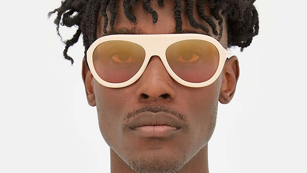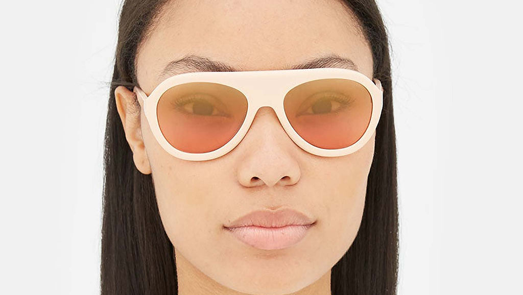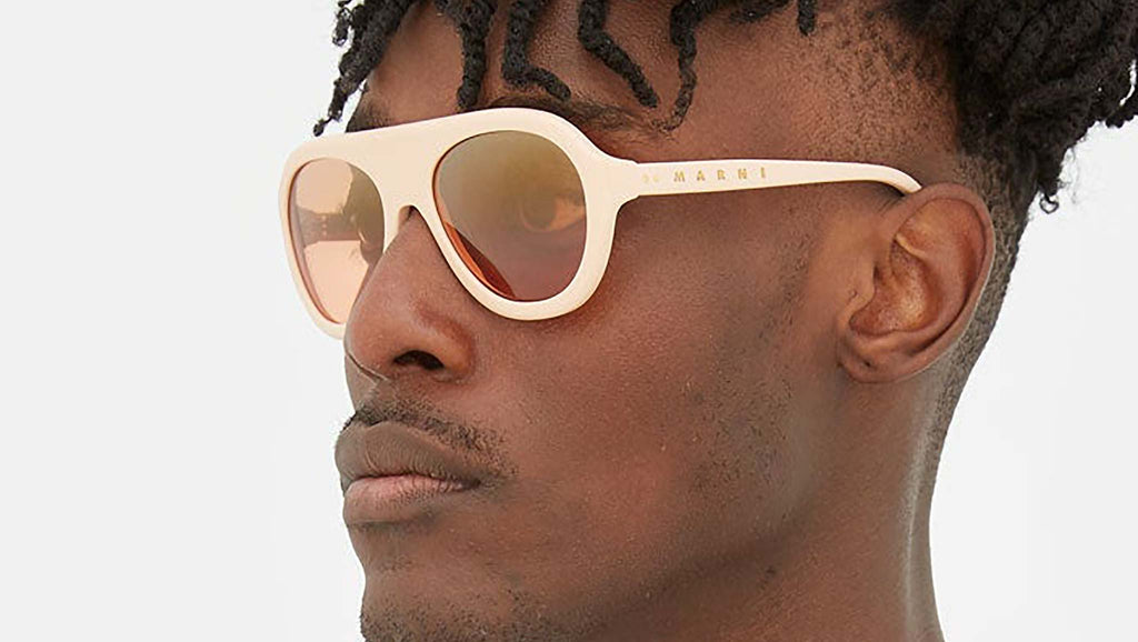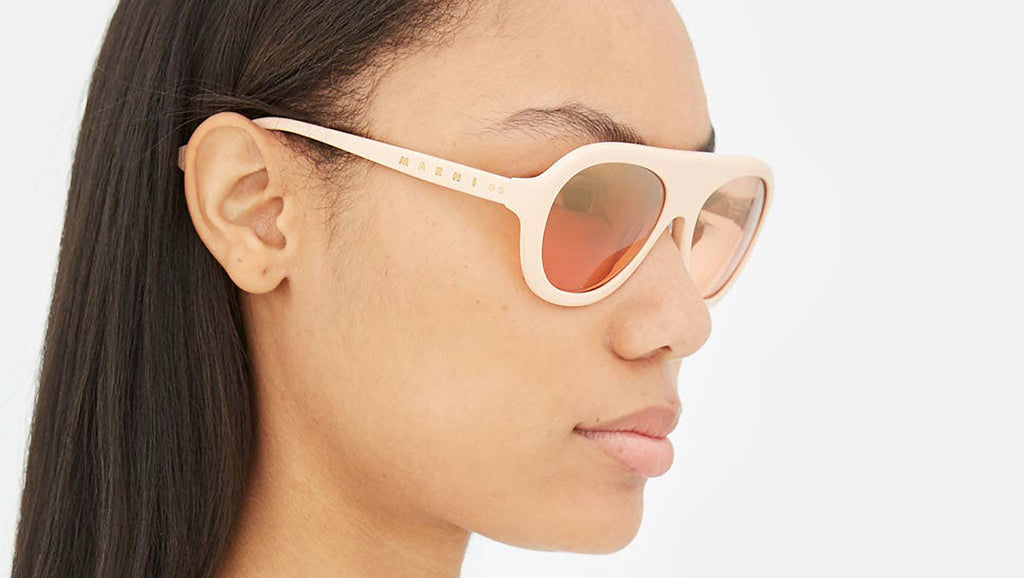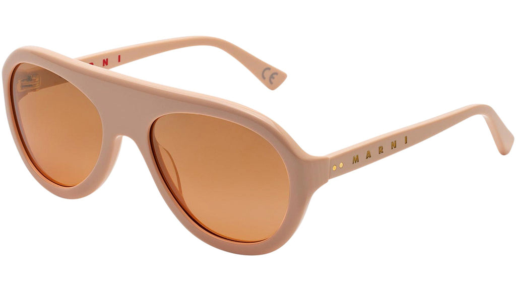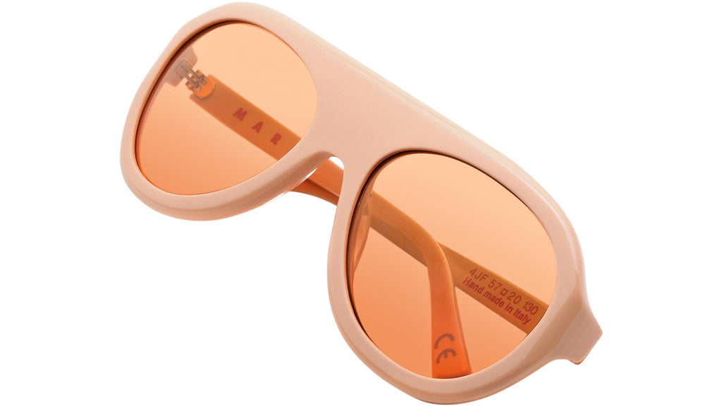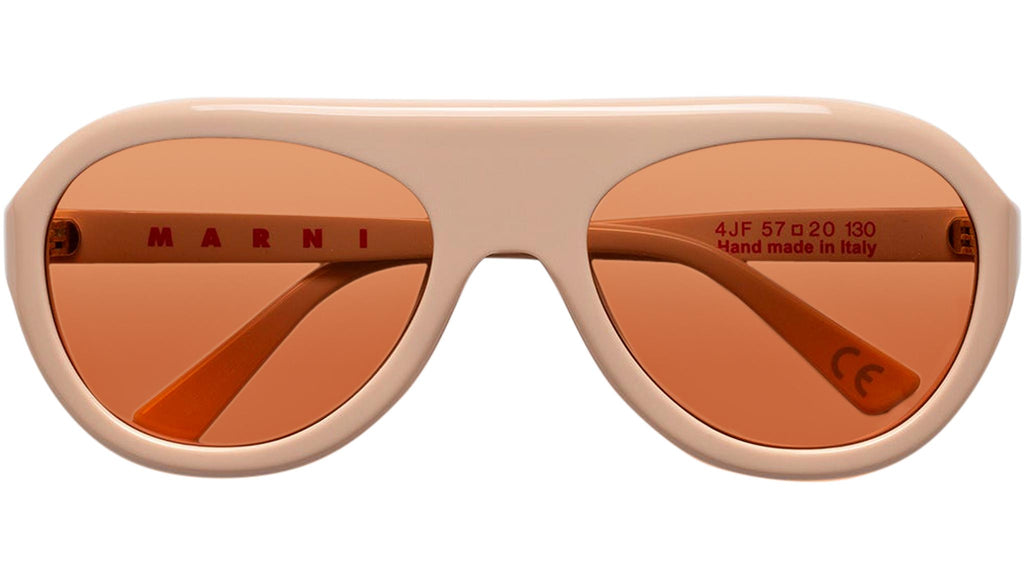 Mount Toc is a bold interpretation of classic aviator-style designs. In true Marni fashion, this timeless design was updated with bold geometries and quirky detailing, for an aesthetics that references 1970s sportswear glamour. Its broad structure features a sturdy nose-bridge and pear-shape lenses encased within chunky acetate rims. This model comes in a light pink acetate with fading orange lenses. Sizes: R Lens Width: 57 mm. Frame Front: Frame Side: 130 mm. Product Code Size R: 4JF