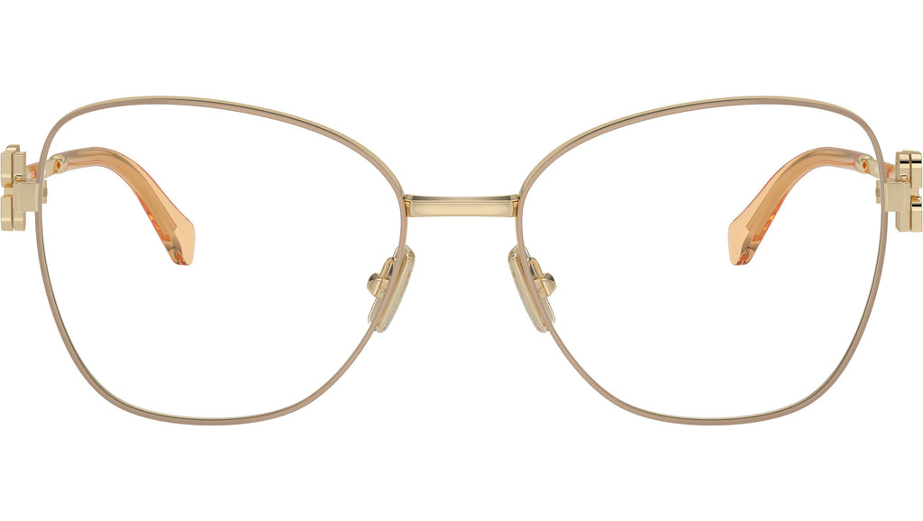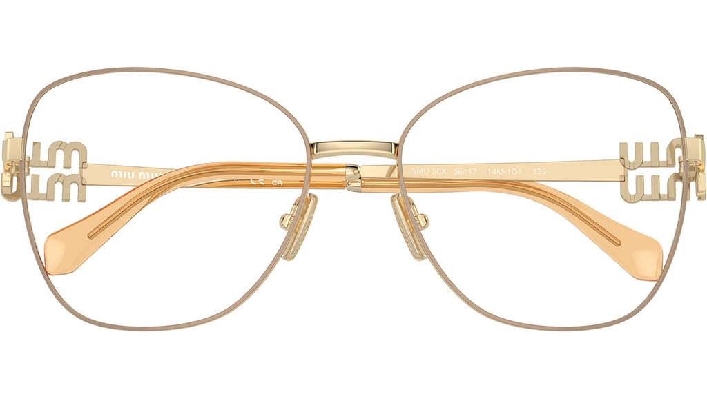 Occhiali da vista Miu Miu modello 50XV codice colore 14M1O1 con montatura in metallo color beige e lenti demo. Miu Miu offre creazioni uniche, in cui la costante ricerca stilistica si combina perfettamente con la maestria artigianale della lavorazione. Le silhouette femminili e sinuose delle montature sono espressione di una ricchezza dei dettagli che rispecchia pienamente i codici stilistici e l’indiscusso talento del brand nell’unire il design non convenzionale ad un romanticismo dai rimandi retrò. - Rivenditore autorizzato Miu Miu online. Il prodotto viene consegnato completo di confezione e accessori originali ed è coperto dalla garanzia globale del produttore di 12 mesi.
