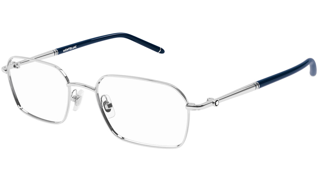 Occhiali da vista Montblanc linea Established modello MB0245O variante colore argento lucido con astine color lenti demo.