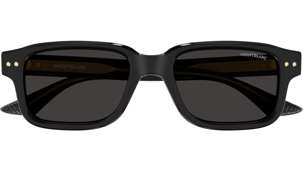 Occhiali da sole Montblanc modello MB0286S rectangle linea Meisterstück in acetato riciclato, codice colore 001 nero lucido tinta unita con aste color nero e lenti color grigio tinta unita.
