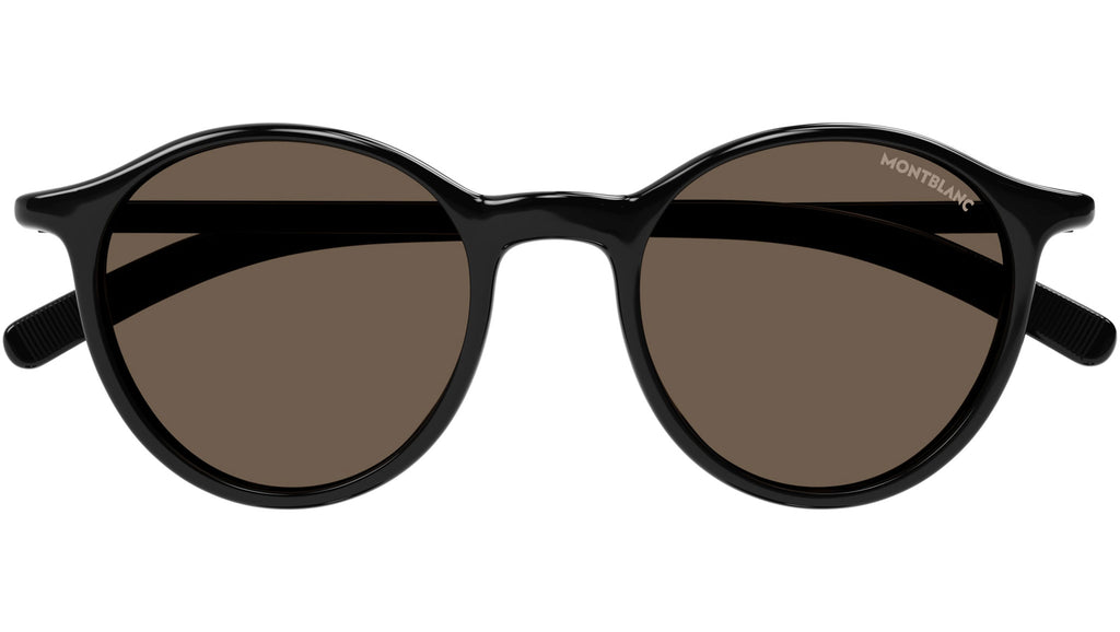Occhiali da sole Montblanc modello MB0324S linea Snowcap forma panto in acetato iniettato riciclato, codice colore 001 nero lucido con aste color nero e lenti color marrone tinta unita.