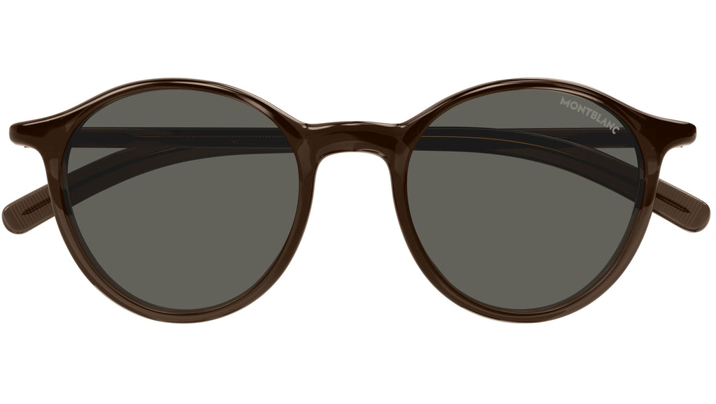 Occhiali da sole Montblanc modello MB0324S linea Snowcap forma panto in acetato iniettato riciclato, codice colore 002 marrone trasparente lucido con aste color marrone e lenti color grigio tinta unita.