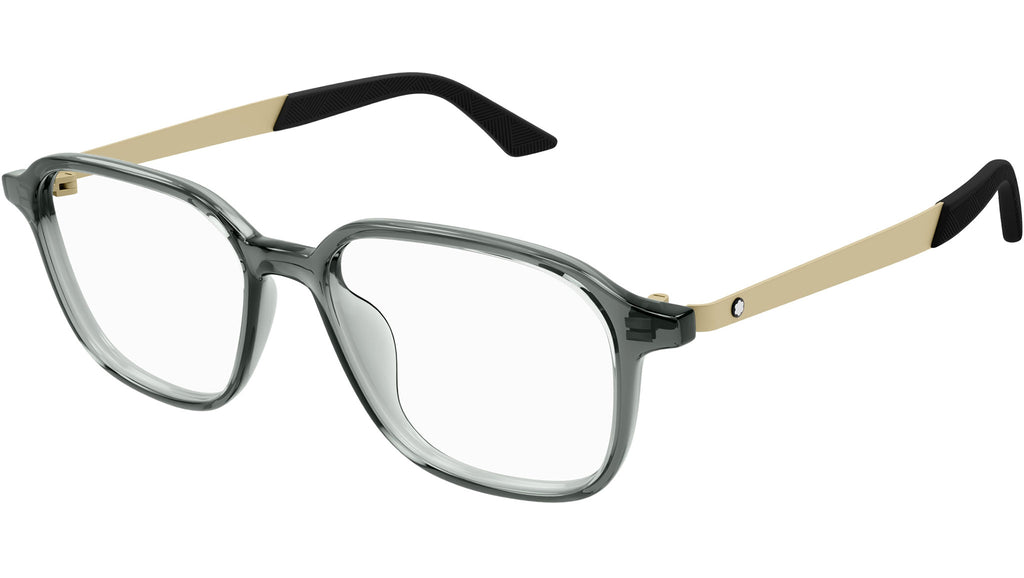 Occhiali da vista Montblanc modello MB0335OA linea Extreme forma panto in acetato riciclato, codice colore 004 grigio trasparente lucido con aste color oro e lenti demo.