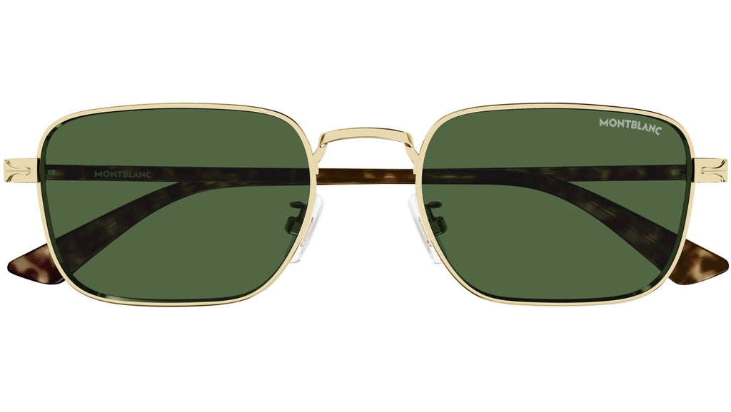 Occhiali da sole Montblanc modello MB0339S linea Nib forma rettangolare in metallo, codice colore 002 oro endura lucido J5G con aste color tartaruga e lenti color verde solido.