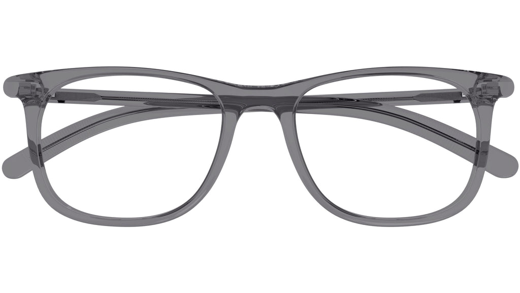 Occhiali da vista Montblanc Snowcap modello MB0351O in acetato iniettato riciclato rettangolare codice colore 003 grigio trasparente lucido con aste in grigio e lenti demo. Rivenditore autorizzato Montblanc online. Gli occhiali vengono consegnati con custodia e accessori originali e sono coperti dalla garanzia ufficiale di 12 mesi del produttore.