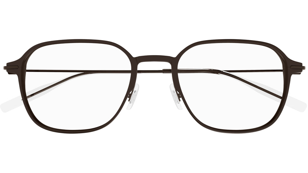 Occhiali da vista Montblanc Snowcap modello MB0358O in alluminio rettangolare marrone scuro semiopaco con aste in marrone e lenti demo. Rivenditore autorizzato Montblanc online. Gli occhiali vengono consegnati con custodia e accessori originali e sono coperti dalla garanzia ufficiale di 12 mesi del produttore.