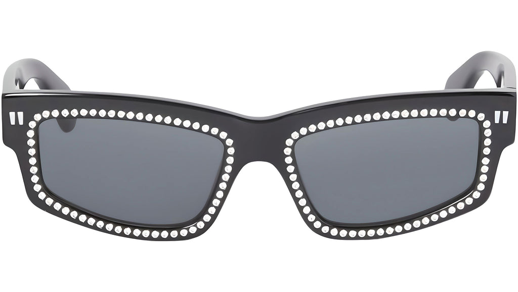 Occhiali da sole Off-White modello Miramar Special codice colore 1307 con frontale in acetato nero pieno + strass e lenti cat. 3 in polimero CR-39 grigio scuro. Rivenditore autorizzato Off-White Eyewear online. Gli occhiali vengono consegnati con custodia e accessori originali e sono coperti dalla garanzia ufficiale di 12 mesi del produttore.