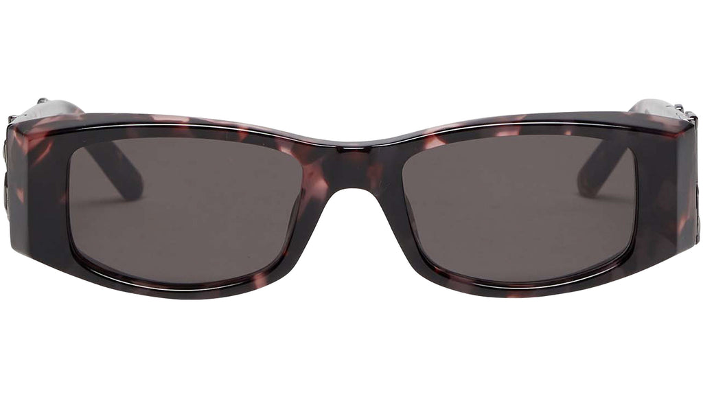 Angel di Palm Angel nasce da un sottile richiamo agli anni 90, che si abbina ad un'attitudine tutta rock. Angel presenta una struttura solida, dove il maxi logo Palm Angels con l'iconico carattere goth del marchio, caratterizza costantemente la personalità, scontrandosi con l'ordinario. La forma è grintosa e rettangolare, caratterizzata dal logo affermativo presente sulle aste. La montatura è interamente realizzata in acetato e gioca sui contrasti e sul volume. La stecca è adornata con metallo galvanizzato sopra il logo in rilievo. Una montatura statement, per uno stile rock anni '90.