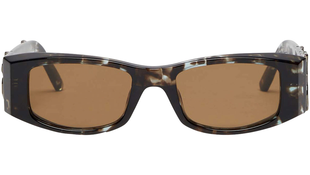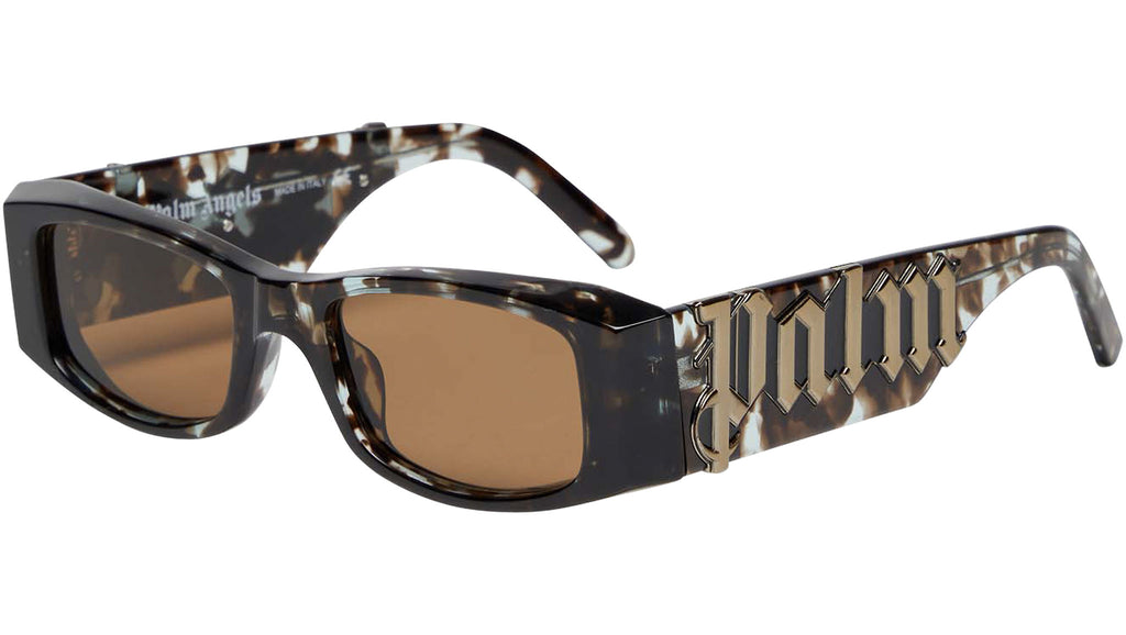 Angel di Palm Angel nasce da un sottile richiamo agli anni 90, che si abbina ad un'attitudine tutta rock. Angel presenta una struttura solida, dove il maxi logo Palm Angels con l'iconico carattere goth del marchio, caratterizza costantemente la personalità, scontrandosi con l'ordinario. La forma è grintosa e rettangolare, caratterizzata dal logo affermativo presente sulle aste. La montatura è interamente realizzata in acetato e gioca sui contrasti e sul volume. La stecca è adornata con metallo galvanizzato sopra il logo in rilievo. Una montatura statement, per uno stile rock anni '90.