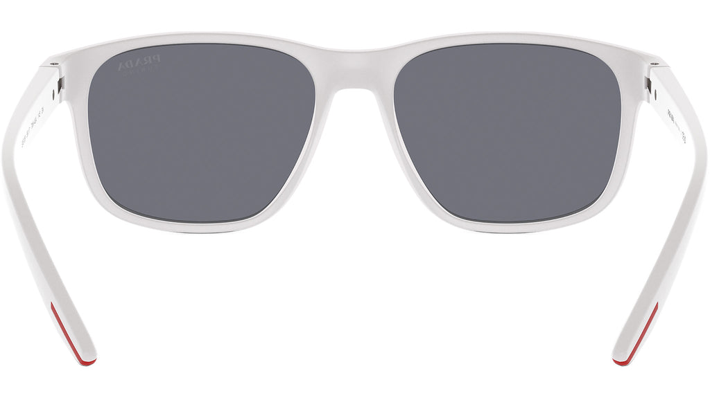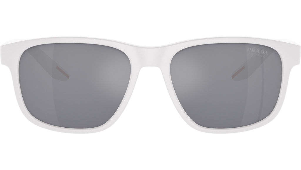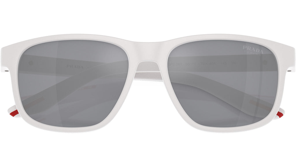 Occhiali da sole Prada Linea Rossa modello PS 06YS codice colore TWK40A con montatura d-frame full rim in iniettato color bianco gommato e lenti in policarbonato color azzurro chiaro a specchio argento. Rivenditore autorizzato Prada. Ogni prodotto Prada Linea Rossa viene consegnato con astuccio originale e accessori.