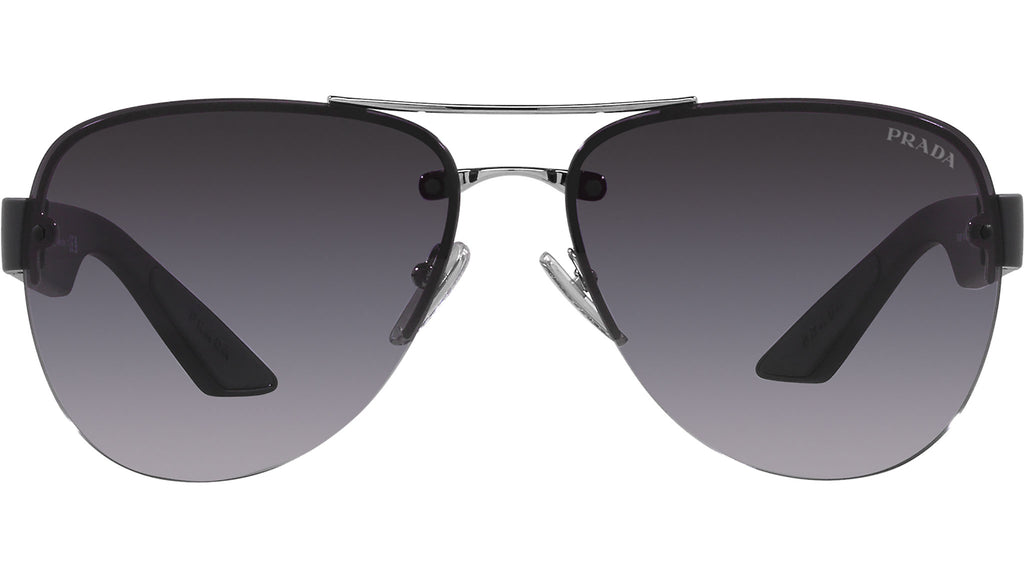 Occhiali da sole Prada Linea Rossa modello PS 55YS codice colore 1BC09U con montatura aviatore semi rim in metallo color argento e lenti in poliammide color grigio sfumato. Rivenditore autorizzato Prada. Ogni prodotto Prada Linea Rossa viene consegnato con astuccio originale e accessori.