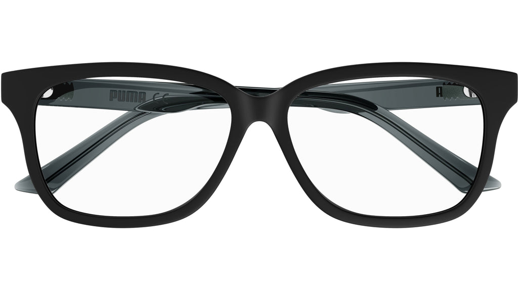 Occhiali da vista Puma Tweens modello PJ0070OA variante colore 003 nero opaco con astine color grigio.