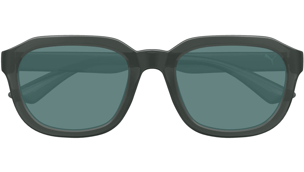 Occhiali da sole Puma Essential modello PU0461S variante colore 004 grigio scuro trasparente lucido con lenti color blu verde tinta unita. Rivenditore autorizzato Puma online. Gli occhiali vengono consegnati con custodia e accessori originali e sono coperti dalla garanzia ufficiale di 12 mesi del produttore.