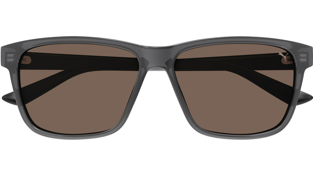Occhiali da sole Puma Essential modello PU0467S variante colore 004 grigio trasparente opaco con lenti color marrone rossastro tinta unita. Rivenditore autorizzato Puma online. Gli occhiali vengono consegnati con custodia e accessori originali e sono coperti dalla garanzia ufficiale di 12 mesi del produttore.