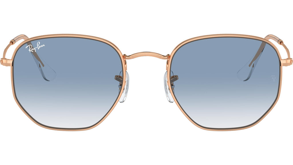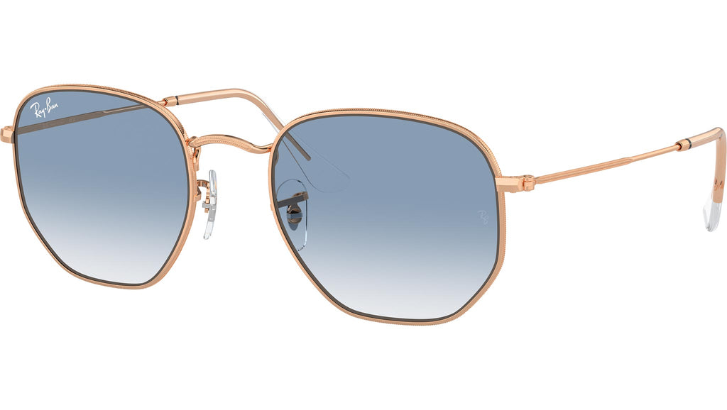 Occhiali da sole Ray-Ban Hexagonal modello RB3548 codice colore 92023F con montatura in metallo color oro rosa e lenti color trasparente e blu. Ray-Ban rappresenta lo stile senza tempo, la semplicità e la libertà di espressione. Come brand di occhiali leader da generazioni, Ray-Ban è all'avanguardia dei cambiamenti culturali e simboleggia l'individualità e la personalità dei tempi. Dal suo debutto, con l'iconico Aviator, creato originariamente per i piloti dell'aviazione degli Stati Uniti, Ray-Ban è stato indossato da celebrità e personaggi pubblici in tutto il mondo, diventando un simbolo di stile e raffinatezza.