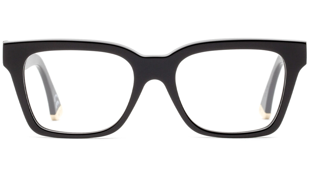 America is an angular, wide silhouette with thick rims and sharply defined angles. A redesign of the classic RSF model, this version of America features a light, yet sturdy structure for an all-day-everyday use. Thismodel comes in a shiny black acetate. Prescription lenses not included.The box contains a hard case and a cleaning cloth.