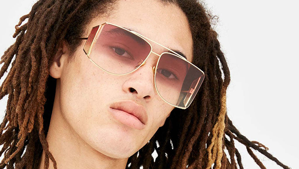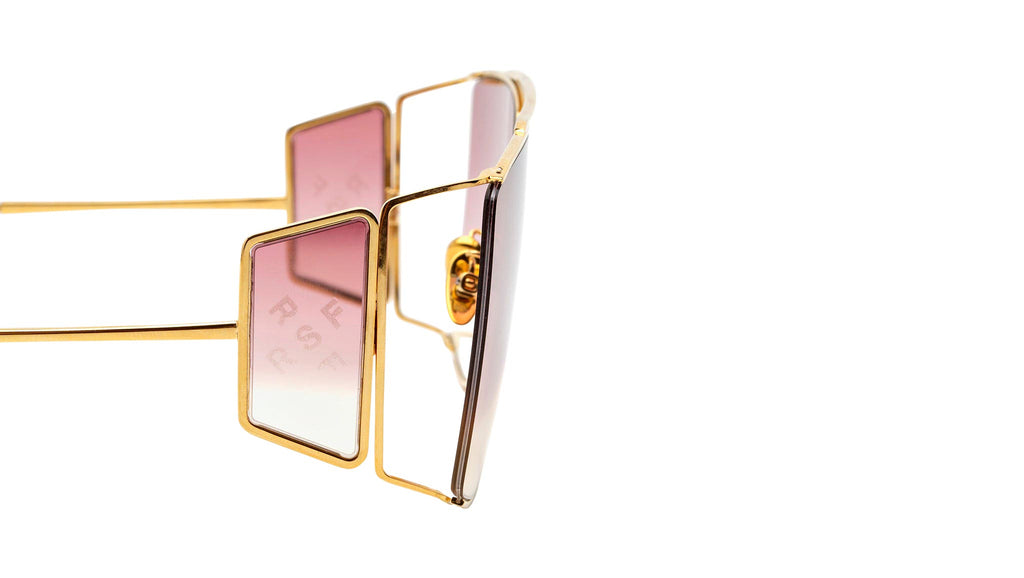 A forward-looking shape, Autore reinvents the classic design of aviator-style frames, adding a whole new dimension with an emphasis on both wearability and cutting-edge style. An all-metal frame, Autore is characterized by a double nose-bridge and light metal rims. The model features a unique lens shape, with a straight edge on the outer line. Oversized metal rims keep the lenses tightly in place, while leaving the edges exposed for a unique, edgy statement. This version features silver rims and tinted red lenses. Sizes: R Lens Width: 63 mm. Frame Front: 146 mm. Frame Side: 140 mm. Product Code Size R: I5O