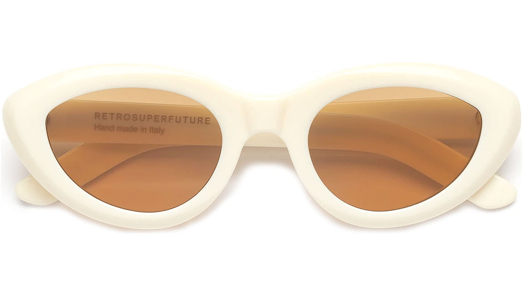 Designed for Spring/Summer 2021 collection, Cocca is a playful silhouette characterized by its thick curvaceous lines and features. A fresh interpretation of cat-eye vintage frames, with thick acetate construction, low nose-bridge and wide lenses. This model comes in a ivory acetate with brown lenses. The box contains a semi-hard case and a cleaning cloth.