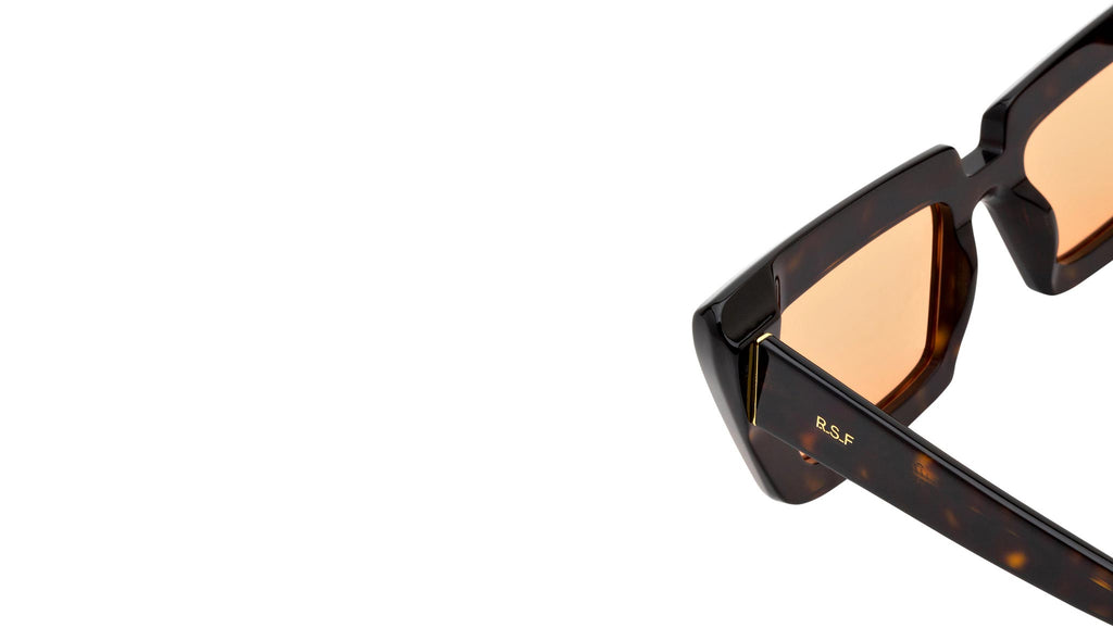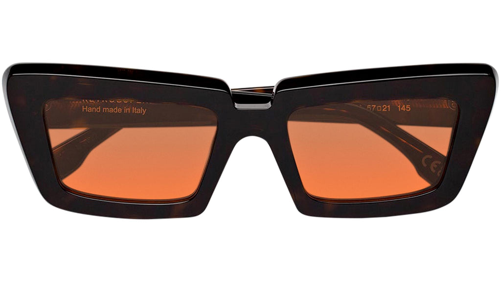 Coccodrillo is a stand-out silhouette conceived as a modern edgy frame. An experimental, innovative piece, Coccodrillo is a deliberately oversized shape featuring thick pointed rims. With precise geometries and slanted edges, this model oozes with character. This playful version of Coccodrillo comes in a spotted Havana acetate with bright orange tinted lenses. Sizes: R Lens Width: 57 mm. Frame Front: Frame Side: 145 mm. Product Code Size R: 17M