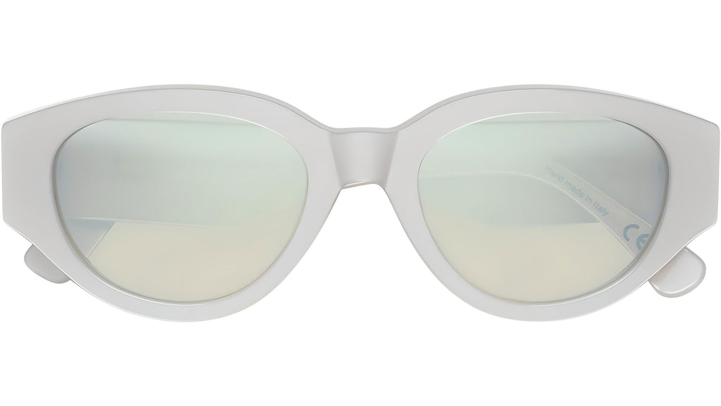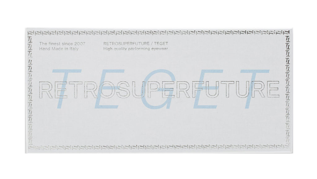 For the brand’s first eyewear, Ana Kraš chose a shape she personally loves and has been the only sunglasses she has worn for a decade - the RSF iconic Drew Mama. The Drew Mama is a historical RSF Icon, featuring distinctive oversized silhouette with clean geometric lines, offering a modern twist on classic eyewear. Carved from Italian acetate, these sunglasses ensure a comfortable fit for an all-day-everyday wear, while the high quality material and lenses guarantee 100% UV protection. This Retrosuperfuture / Teget Drew Mama comes in a unique acetate with ice looking finish paired with lightly mirrored silver Carl Zeiss lenses and blue and white Swarovski hand set stones. Sizes: R. Lens Width: 53 mm. Frame Front: 145 mm. Frame Side: 145 mm. Product Code Size R: IJ7.