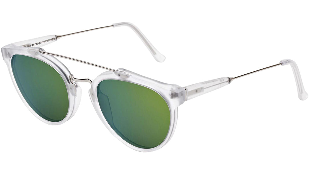 Retrosuperfuture sunglasses model Giaguaro Crystal Matte Petrol. Sizes: R / L Lens Width: 51 / 53 mm. Frame Front: 133 / 138 mm. Frame Side: 145 mm. Product Code Size R: HS9 Product Code Size L: K4J