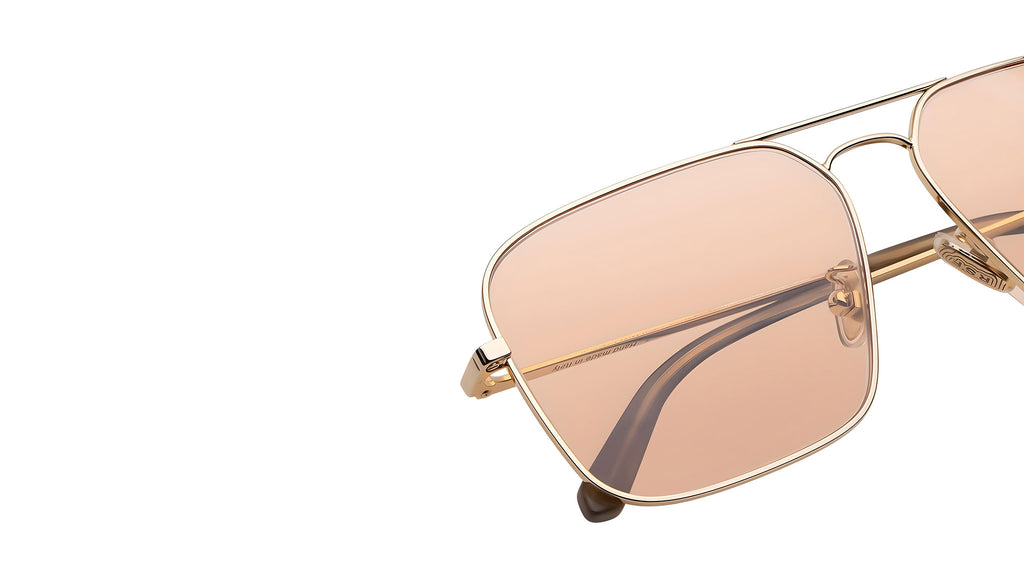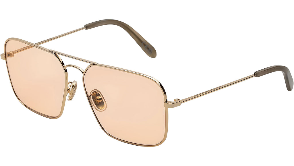 Iggy is a fresh boxy spin-off from the classic shaped aviator frames. The sturdy metal frame is characterized by a clean and essential structure, double metal bridge and wide rectangular lenses. This version of the model features elegant and classic finish with gold metal galvanic and playful pink lenses juxtaposed with shiny crystal grey acetate on the temple tips. Sizes: R. Lens Width: 58 mm. Frame Front: 0 mm. Frame Side: 140 mm. Product Code Size R: VDB.