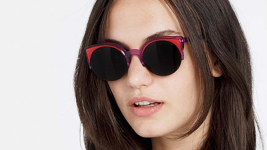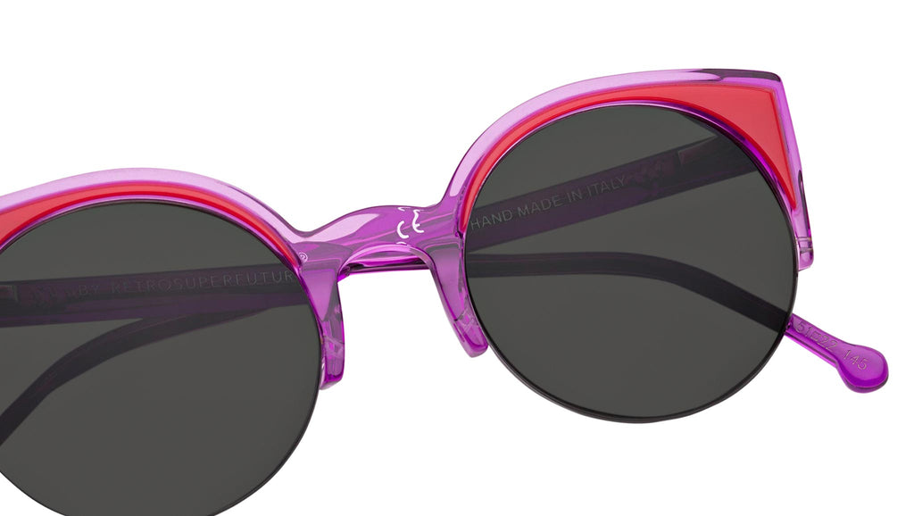 Retrosuperfuture sunglasses model Lucia Surface Uva. Sizes: R Lens Width: 51 mm. Frame Front: 132 mm. Frame Side: 145 mm. Product Code Size R: KV8