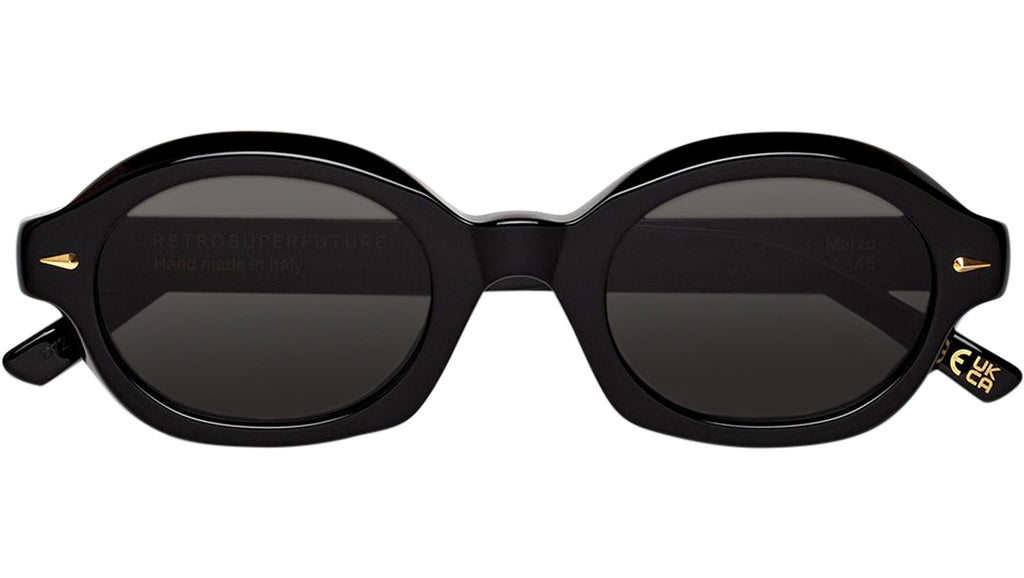 Oval and compact, Marzo is an exciting silhouette in RSF’s roster. Characterized by chunky acetate rims, a signature RSF feature, the model draws inspiration from 1960s shapes, with its low, protruding temple tips and oval lenses. With hand-crafted decors and sleek temples, this is a fresh take on casual everyday sunglasses. This version comes in a black finish with black lenses and gold decors. Sizes: R Lens Width: 50 mm. Frame Front: Frame Side: 145 mm. Product Code Size R: D7Z