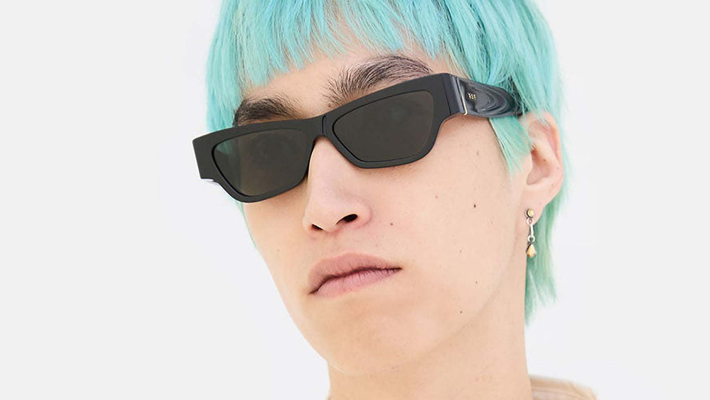 Nameko is an edgy and mischievous eyewear piece that embodies RSF's playful design approach. With a low-riding, wide silhouette, the frame includes a thick brow-line and sturdy geometric frontal frame. The lower half of the frame features slanted, thinner rims. Notably, Nameko stands out with its unique and otherworldly thermoform design on the temples, making it a distinctive and contemporary eyewear piece. This version comes in a timeless black acetate and matching lenses. Sizes: R Lens Width: 56 mm. Frame Front: Frame Side: 140 mm. Product Code Size R: K8U