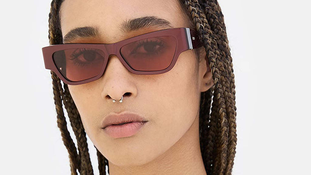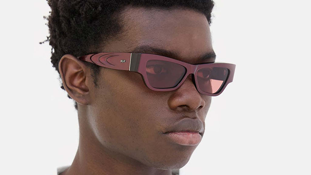 Nameko is an edgy and mischievous eyewear piece that embodies RSF's playful design approach. With a low-riding, wide silhouette, the frame includes a thick brow-line and sturdy geometric frontal frame. The lower half of the frame features slanted, thinner rims. Notably, Nameko stands out with its unique and otherworldly thermoform design on the temples, making it a distinctive and contemporary eyewear piece. This version comes in a metallic burgundy acetate and matching lenses. Sizes: R Lens Width: 56 mm. Frame Front: Frame Side: 140 mm. Product Code Size R: E2S