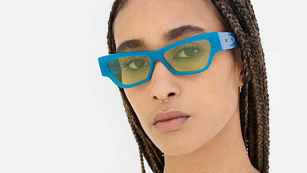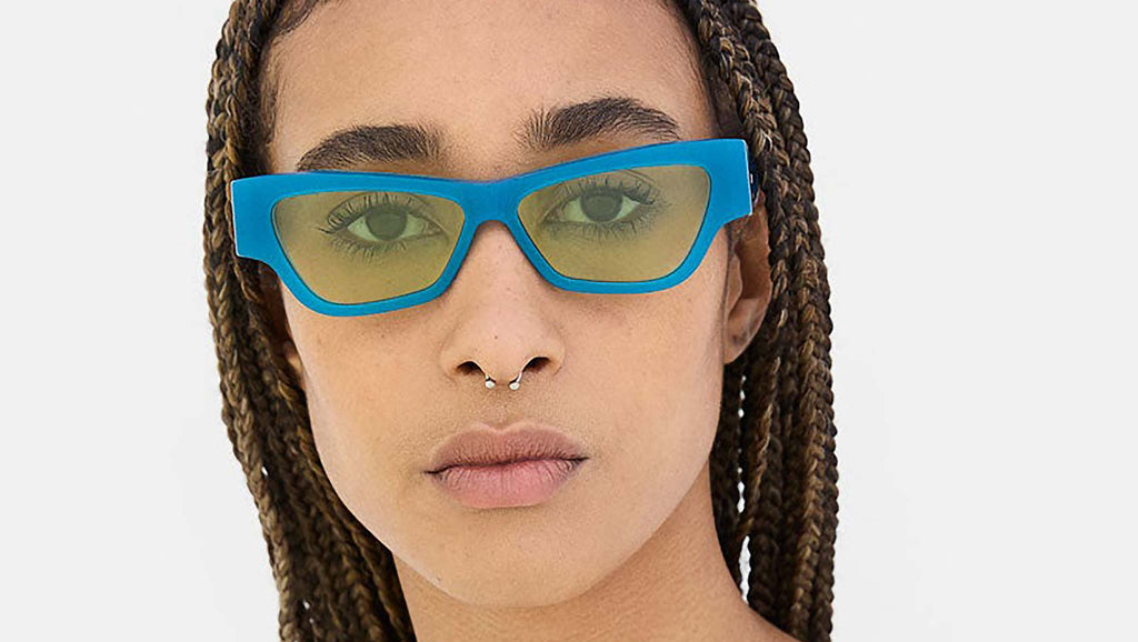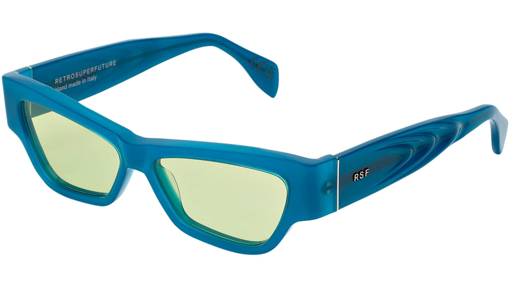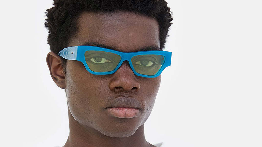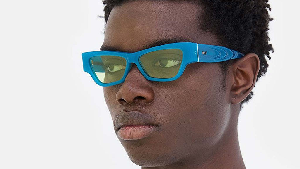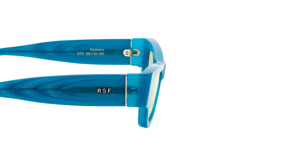 Nameko is an edgy and mischievous eyewear piece that embodies RSF's playful design approach. With a low-riding, wide silhouette, the frame includes a thick brow-line and sturdy geometric frontal frame. The lower half of the frame features slanted, thinner rims. Notably, Nameko stands out with its unique and otherworldly thermoform design on the temples, making it a distinctive and contemporary eyewear piece. This version comes in an opaline blue acetate and acid green lenses. Sizes: R Lens Width: 56 mm. Frame Front: Frame Side: 140 mm. Product Code Size R: 27H