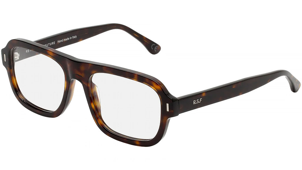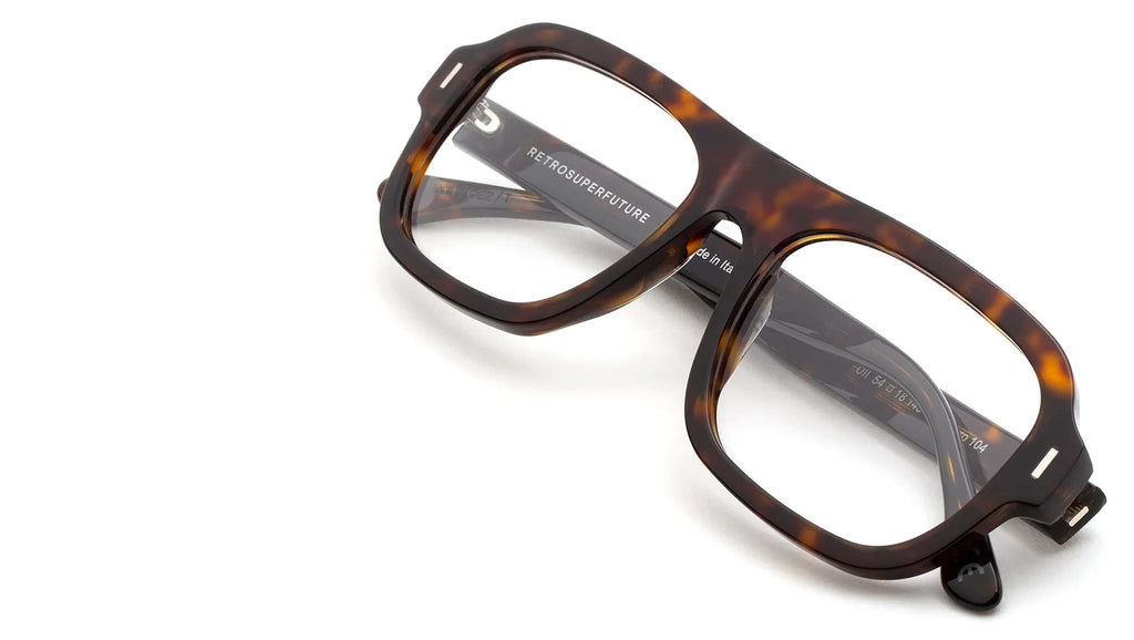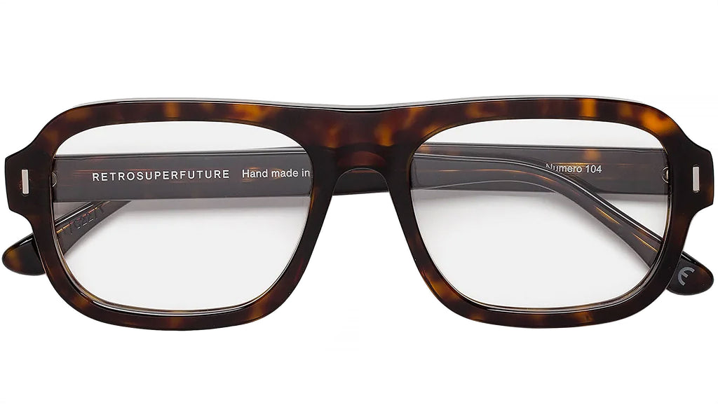 Numero 104 by Retrosuperfuture is a bold silhouette with a sharp and straight-forward street edge. Inspired by authentic streetwear culture that is at the root of RSF design, this model features a streamlined shape with distinctive character. Its almost-straight nose bridge gives it a uniquely sharp character, while its thick acetate rims highlight the wide lenses. This version comes in a vibrant 3627 Havana acetate. Sizes: R Lens Width: 54 mm. Frame Front: Frame Side: 145 mm. Product Code Size R: UII