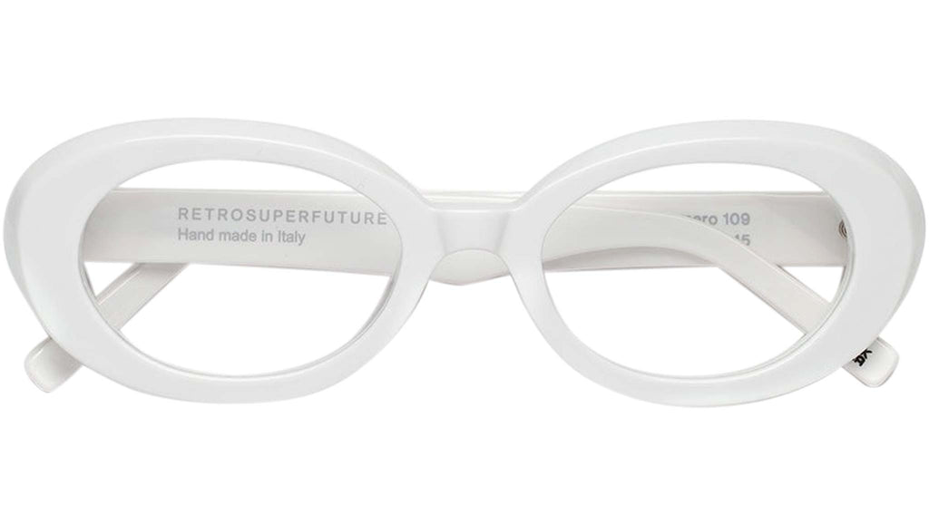 Numero 109 by Retrosuperfuture is a playful contemporary shape characterised by an ovaloid profile and distinctive curved rims. A modern reinterpretation of 90s cut frames, this is a unique silhouette for everyday use. Its sturdy construction has been sculpted on the sides for lightness, ensuring a comfortable fit for everyday use and highlighting RSF’s impeccable craftsmanship. Numero 109 comes in a bold solid white acetate that elevates its rounded form. Sizes: R Lens Width: 53 mm. Frame Front: Frame Side: 145 mm. Product Code Size R: GF2