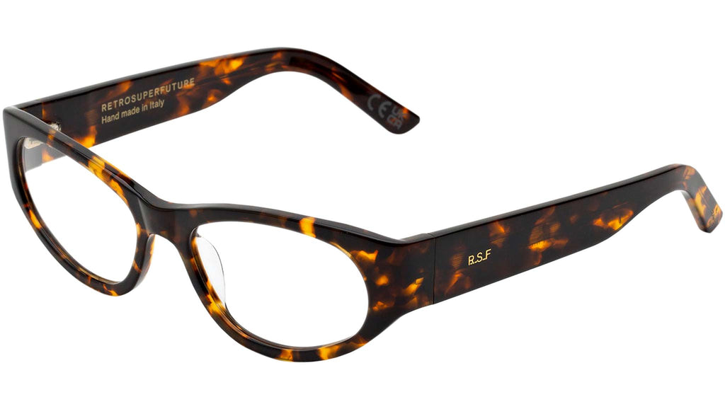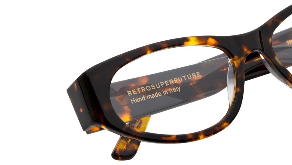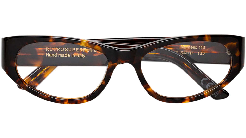 Numero 112 by Retrosuperfuture is an eclectic contemporary frame designed as a crossover between iconic cat-eye shapes and streamlined sportswear pieces. Characterised by a sturdy, compact acetate construction and a slanted profile, Numero 112 features wrap-around temple tips and thick temples. With its bold character and distinctive street edge, Numero 112 redefines everyday eyewear. This is a stand-out RSF Optical silhouette that comes in a deep smoky Havana acetate. Sizes: R Lens Width: 54 mm. Frame Front: Frame Side: 135 mm. Product Code Size R: FMP
