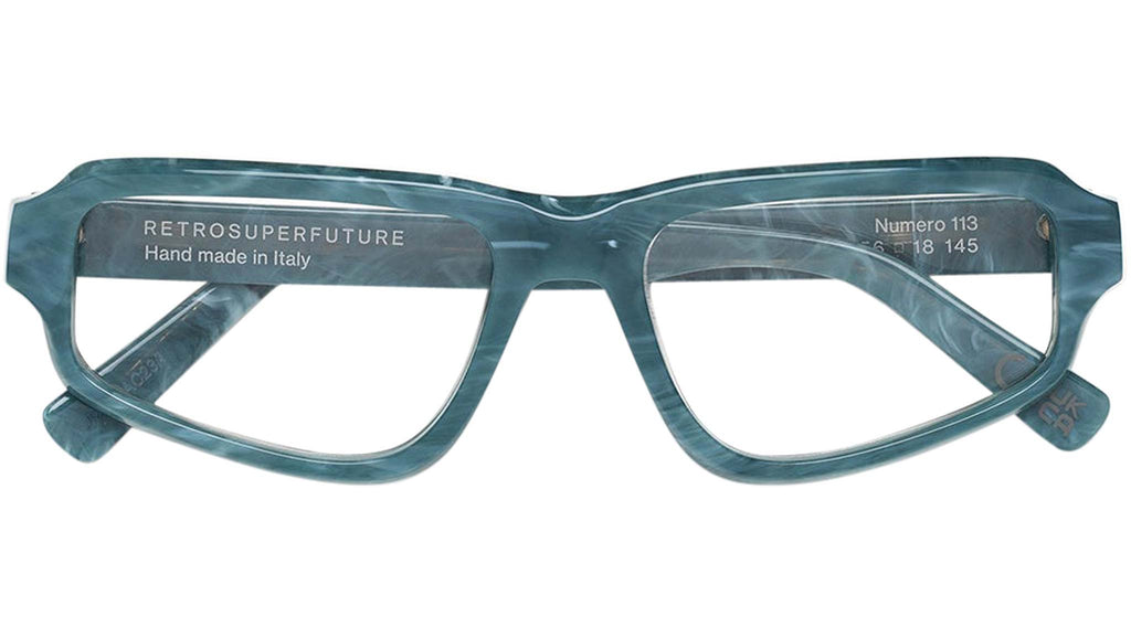 Numero 113 by Retrosuperfuture is a bold Optical frame that oozes with character. Inspired by streamlined, sportswear-style pieces, Numero 113 is designed as a compact mask, with a thick brow-line and slanted lenses. Chiselled acetate rims are shaped for lightness in everyday use, while adding an architectural quality to the frame. This version comes in a unique blue marbled acetate. Sizes: R Lens Width: 56 mm. Frame Front: Frame Side: 145 mm. Product Code Size R: J9F