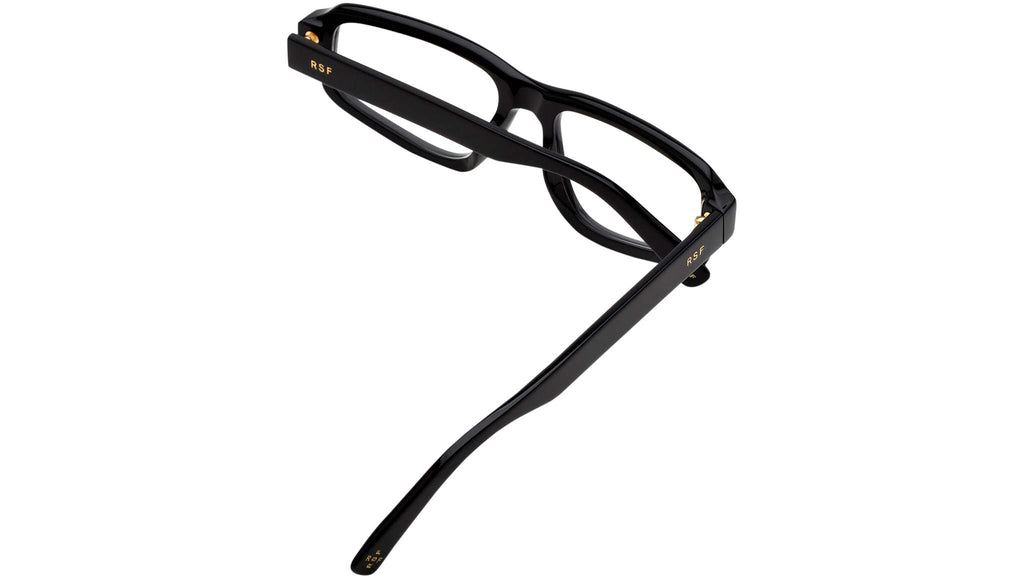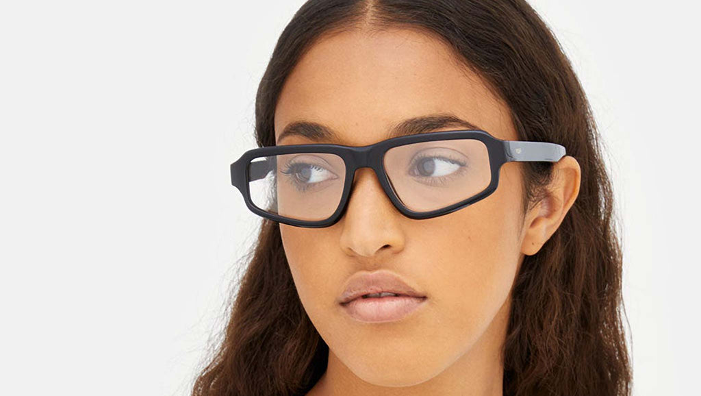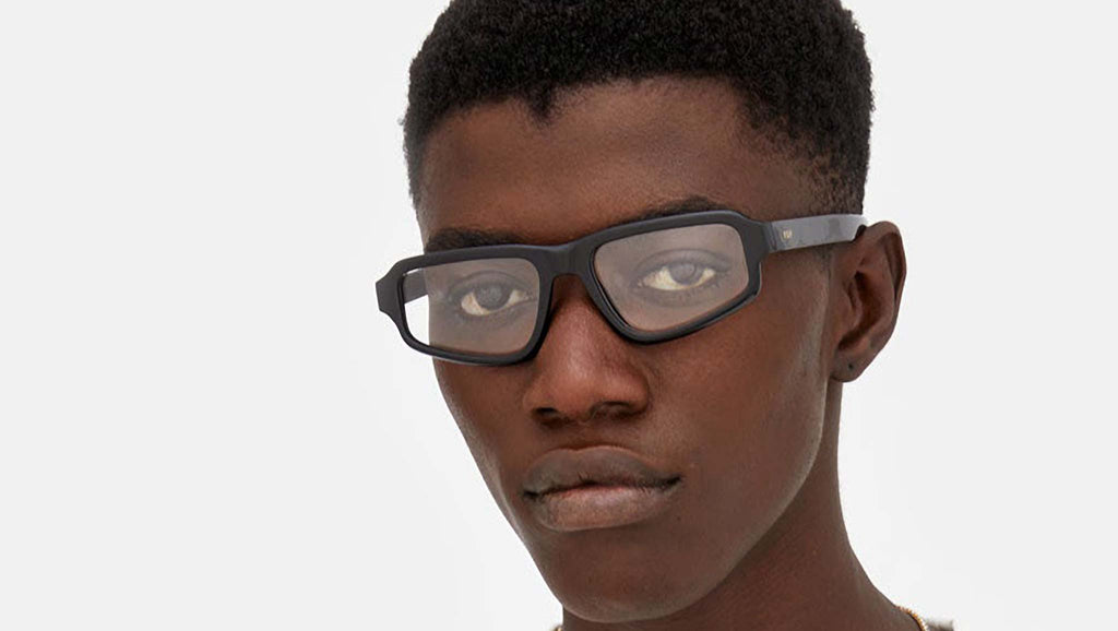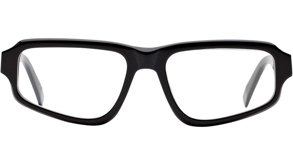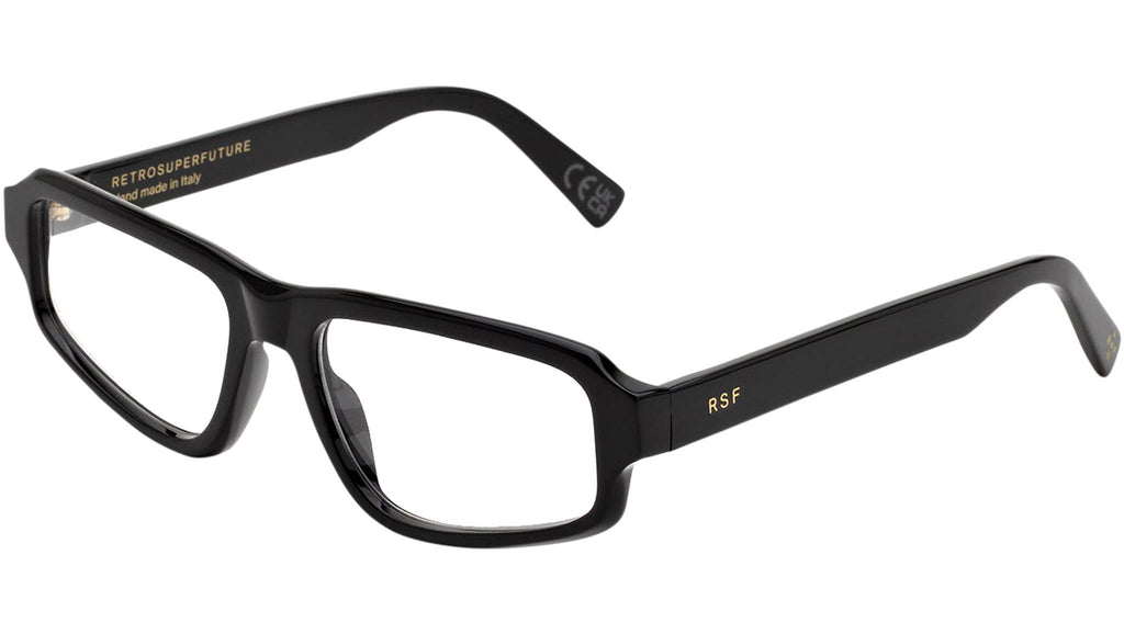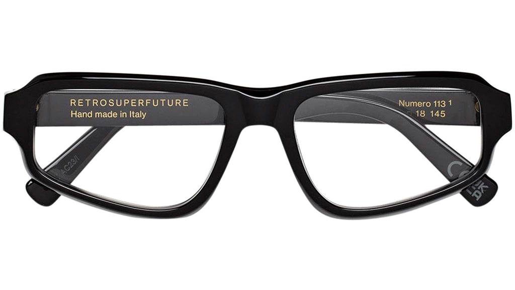 Numero 113 by Retrosuperfuture is a bold Optical frame that oozes with character. Inspired by streamlined, sportswear-style pieces, Numero 113 is designed as a compact mask, with a thick brow-line and slanted lenses. Chiselled acetate rims are shaped for lightness in everyday use, while adding an architectural quality to the frame. This version comes in a shiny black acetate. Sizes: R Lens Width: 56 mm. Frame Front: Frame Side: 145 mm. Product Code Size R: CTL