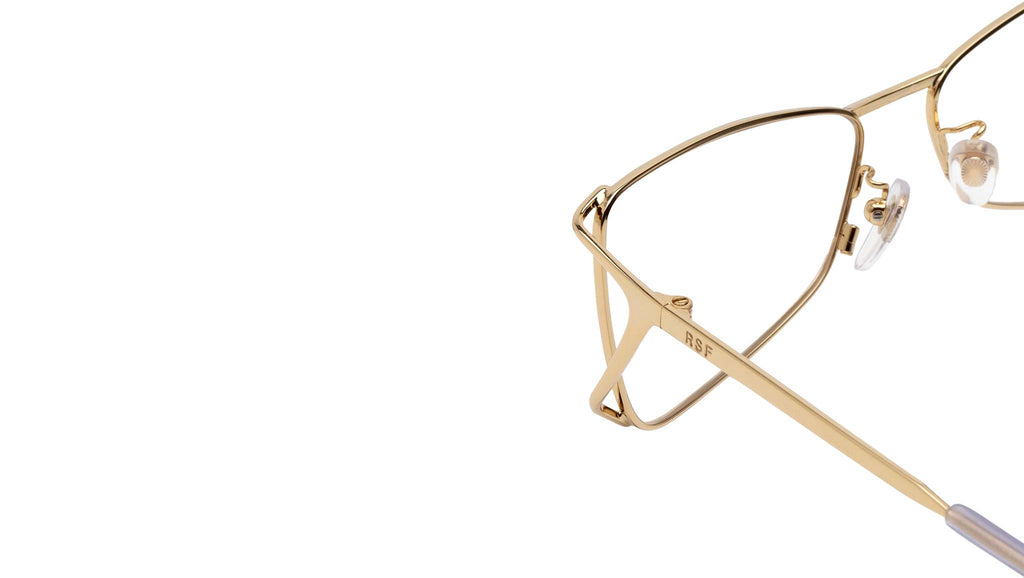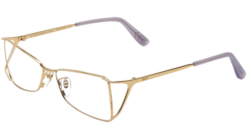 Numero 114 by Retrosuperfuture is a cutting-edge metal frame designed for Optical use. A fresh, modern shape, Numero 114 captures an innovative street aesthetics. Crafted from tubular steel, this functional shape features slanted lenses and hollow temple tips. Well-constructed temples and acetate tips complete this forward-looking frame designed for everyday use. This version of Numero 114 comes in a shiny gold finish. Sizes: R Lens Width: Frame Front: Frame Side: Product Code Size R: 0B8