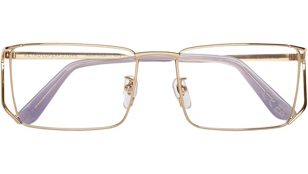 An elevated version of an essential metal frame, Numero 115 is a modern geometric silhouette. The shape has a unique architectural quality, with its squared lenses held together by an innovative metal construction: a fork-like design on the temples crafted from tubular steel highlights RSF’s exceptional know-how in eyewear manufacture. This is a visually sharp yet wearable Optical frame that comes in a classic gold finish. Sizes: R Lens Width: Frame Front: Frame Side: Product Code Size R: TVV