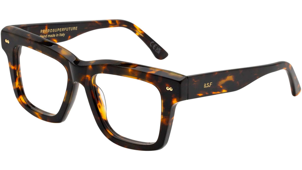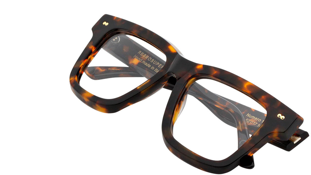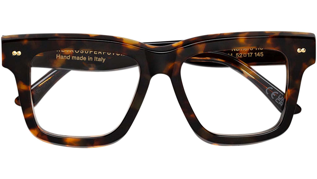 Numero 116 by Retrosuperfuture is a bold Optical frame characterized by an oversized design that reinterprets iconic sun shapes for everyday use. The model features sturdy acetate rims, a key feature of RSF eyewear, chiseled for lightness and comfort, without compromising its thick build. This is a model designed for those looking for a statement yet timeless piece of eyewear. This version comes in a rich Havana acetate. Sizes: R Lens Width: 51 mm. Frame Front: Frame Side: 145 mm. Product Code Size R: A0M