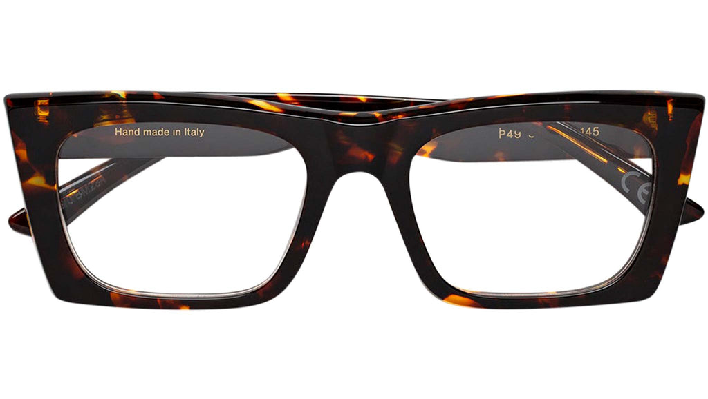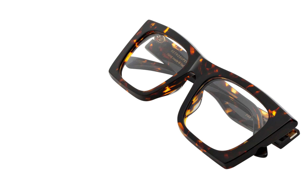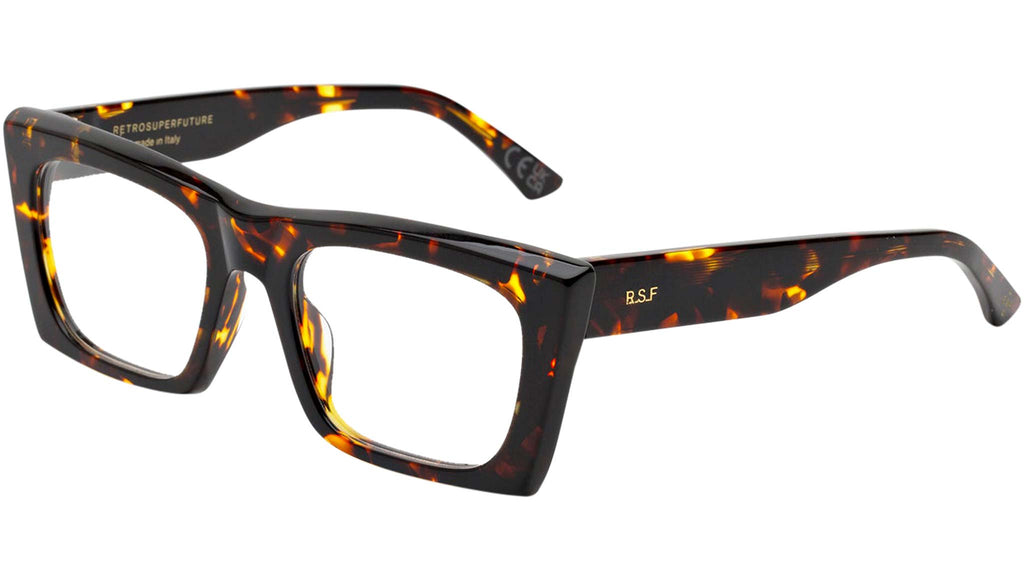 Numero 117 by Retrosuperfuture is an everyday piece of eyewear with character. The model features a sharp, angular profile, with pointy detailing on the temples giving it the characteristic stand-out look it has. A compact, sturdy design, Numero 117 is an elegant yet playful silhouette with a street edge. This model comes in a vibrant Havana acetate that softens its sharp features. Sizes: R Lens Width: 54 mm. Frame Front: Frame Side: 145 mm. Product Code Size R: P49