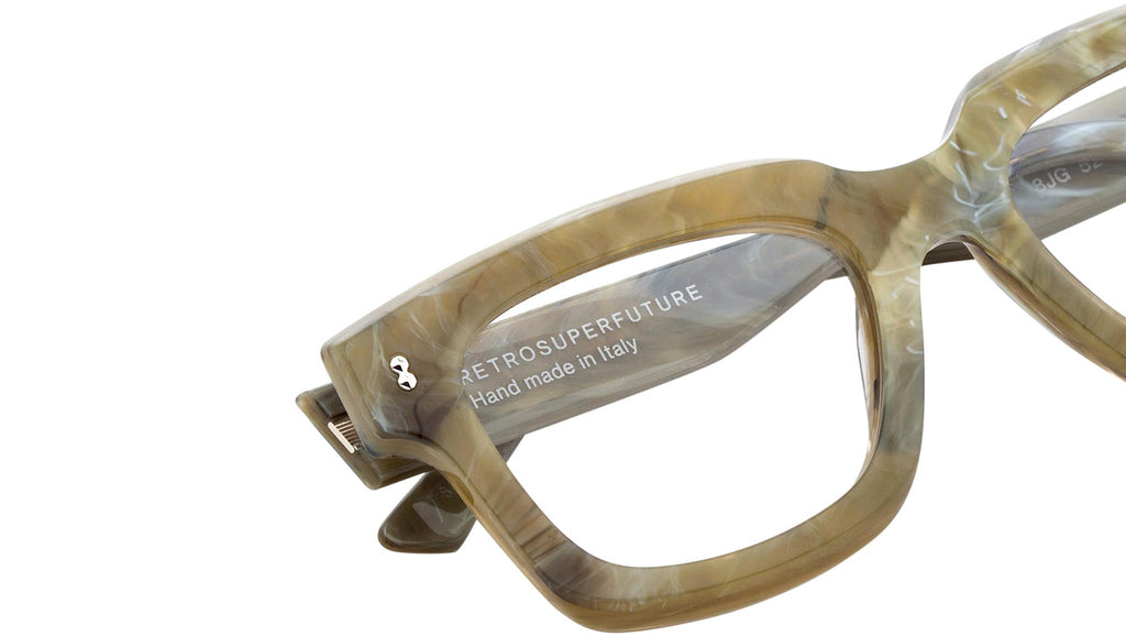 Numero 118 by Retrosuperfuture is a unique silhouette that reinterprets timeless vintage frames with a fresh, contemporary design. Characterized by thick, sturdy rims, the model features two studs on the temples and a keyhole nose-bridge, in reference to 1950s shapes. Its bold proportions and oversized lenses update this classic shape for a sharp modern aesthetics. This silhouette comes in a textured stone acetate with silver detailing. Sizes: R Lens Width: 52 mm. Frame Front: Frame Side: 145 mm. Product Code Size R: 8JG