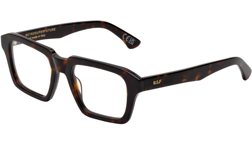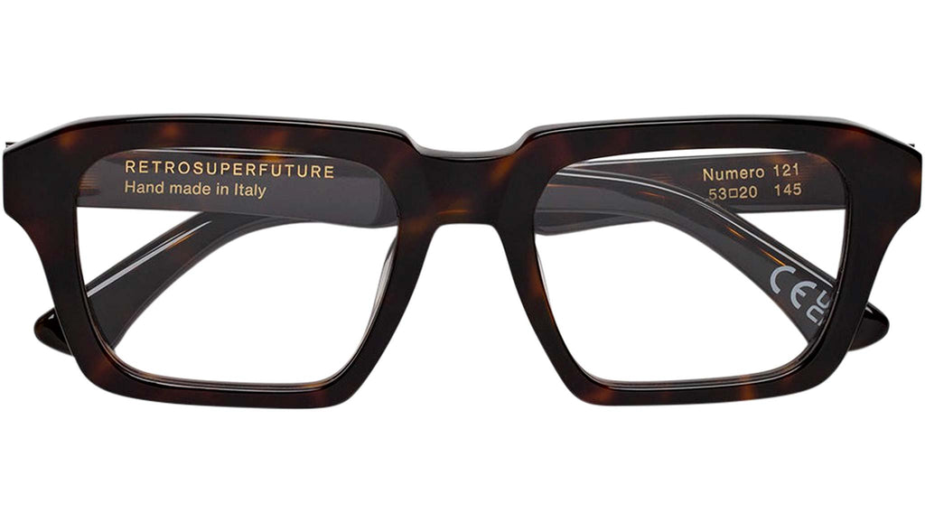 Numero 121 by Retrosuperfuture: an oversized silhouette with a unique character. This optical model features a sturdy geometric acetate frame and temples that fuse a 70s aesthetic with a contemporary touch. This version of N121 is available in a dark havana acetate. Sizes: R Lens Width: 53 mm. Frame Front: Frame Side: 145 mm. Product Code Size R: HQ9