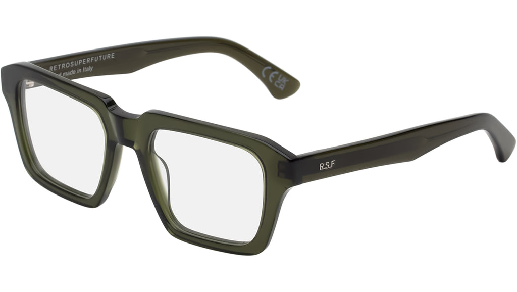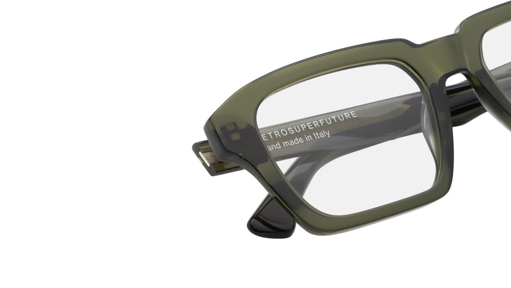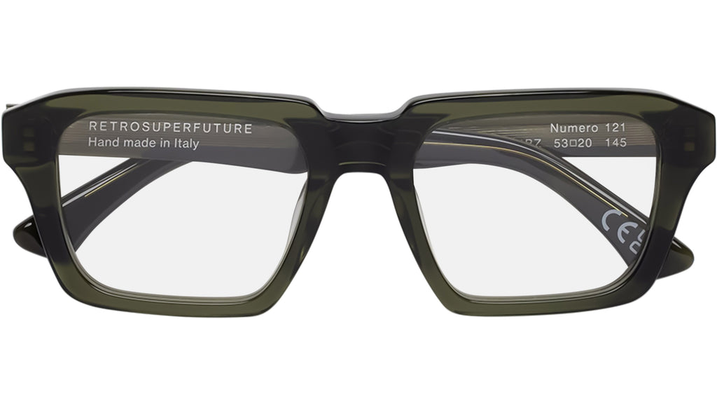 Numero 121 by Retrosuperfuture: an oversized silhouette with a unique character. This optical model features a sturdy geometric acetate frame and temples that fuse a 70s aesthetic with a contemporary touch. This version of N121 is available in crystal grey acetate. Sizes: R Lens Width: 53 mm. Frame Front: Frame Side: 145 mm. Product Code Size R: HQ9